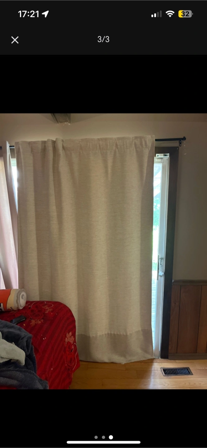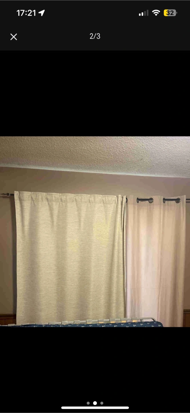 Soft, beige coloured curtains. Looks like it's ready to hang. Perfect for blocking out the sun and getting a good night's sleep.