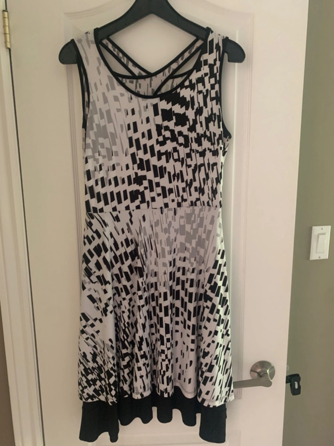 A sleeveless dress. Geometric black and white print. Black trim at the neckline, armholes, and hem. No zipper, goes on over head. Size 4 but fits up to a 6