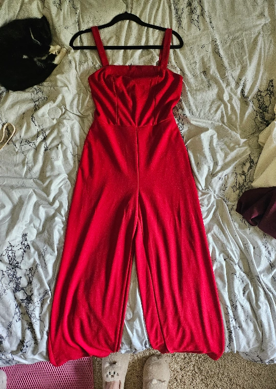 Beautiful red jumpsuit. Wide legs. Zipper closure at the back. Adjustable straps. Perfect for a night out or a casual day, simply slip it on and feel good. Has pockets!!!