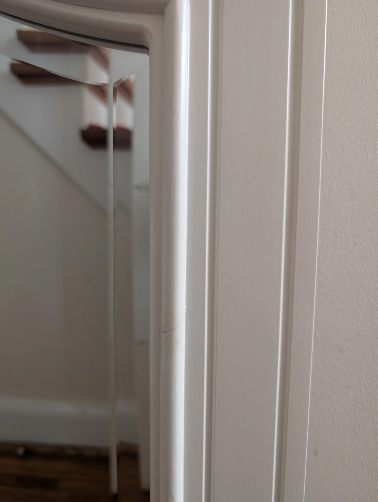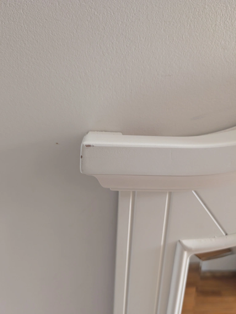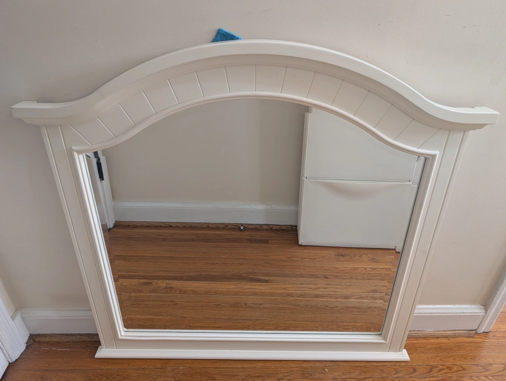 A beautiful off white mirror with a decorative, arched top. Has a rectangular mirror shape. Would be a wonderful addition to any room in your home. Small blemishes as shown in photos Pick up Keele and Rogers Cash only