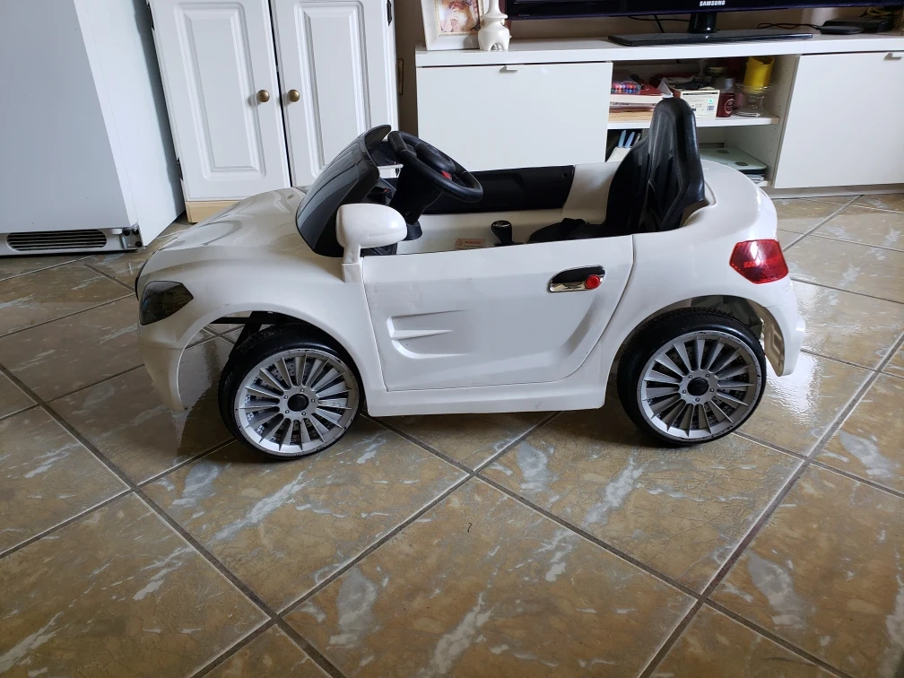 An awesome electric ride-on car for kids, styled like a BMW sports car. It engine sounds, an MP3 player, a steering wheel, a dashboard, a seatbelt, USB connection for "radio" stations with children's songs and doors that open.