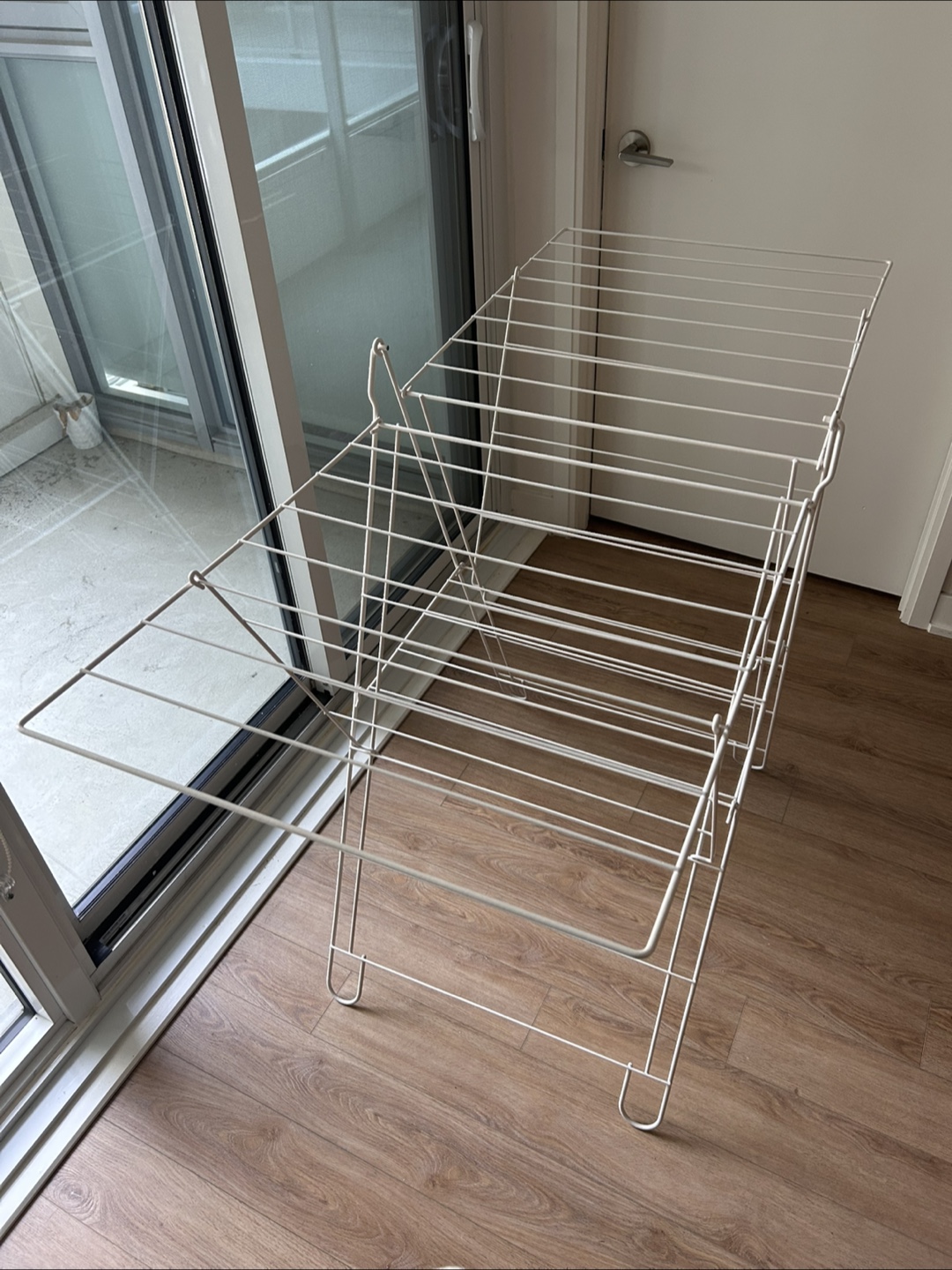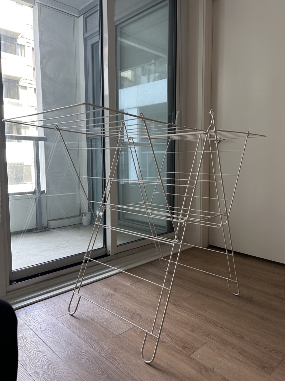 A sturdy drying rack made of metal. It features multiple levels for laying out clothes. The rack folds up for easy storage. A great solution for air drying delicates.
