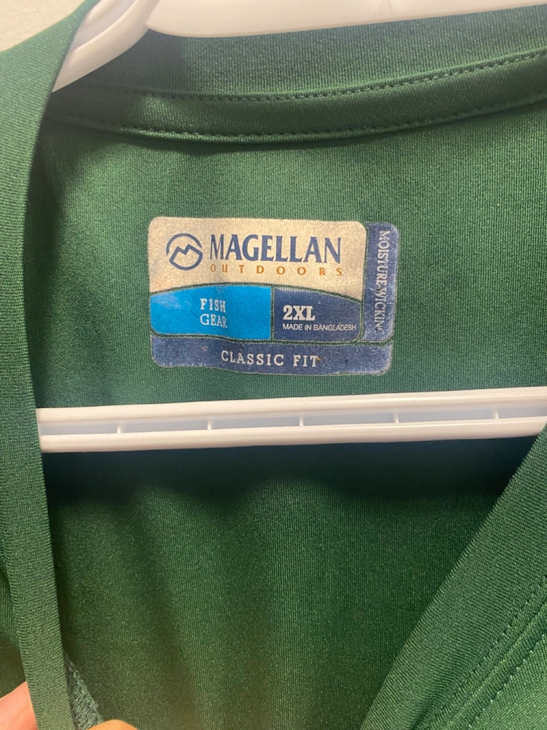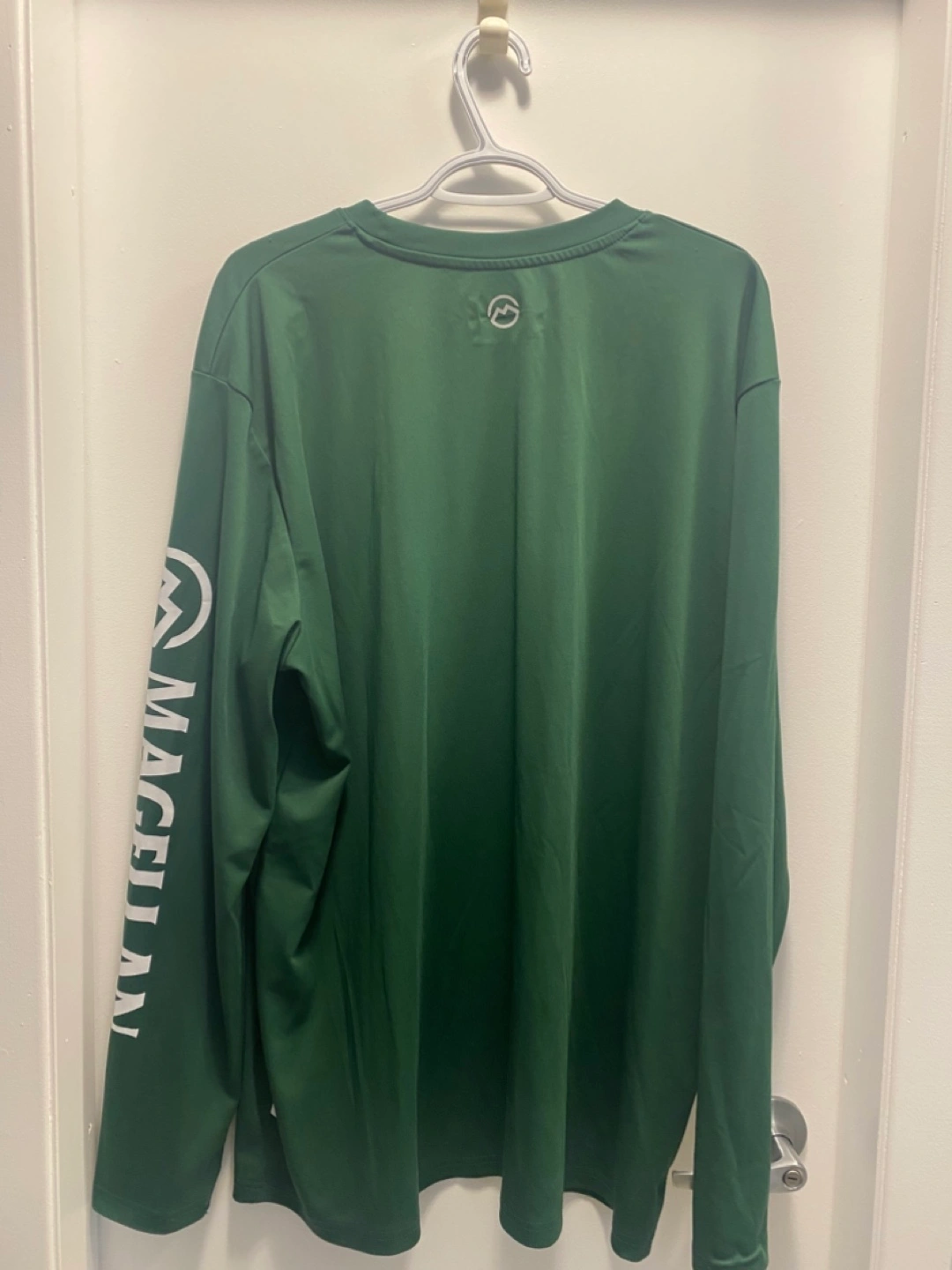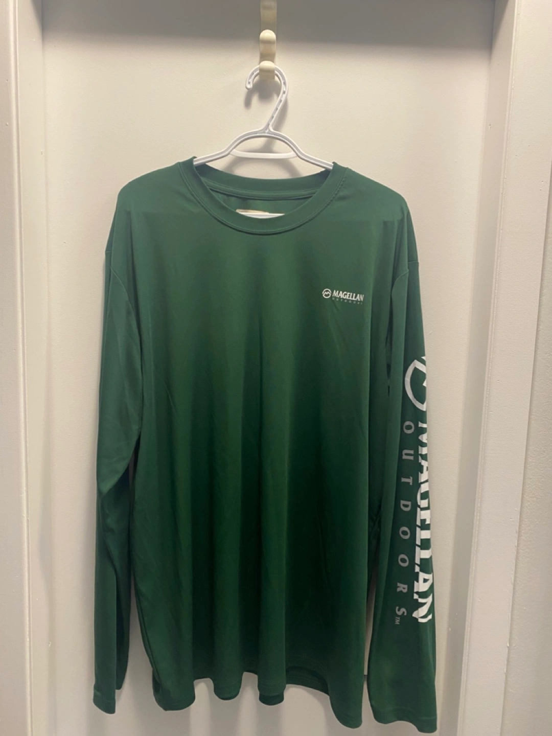 A long-sleeved shirt with a round neckline, in a solid green color. Magellan Outdoors branding on the chest and the sleeve. Ideal for those serene days spent casting a line and waiting for that first bite.