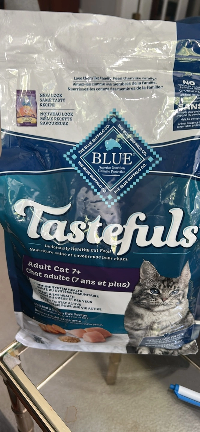 Here is a brand new bag of cat food. Never been opened. It's specifically for adult cats ages seven and up. Our cat has decided she now only likes the cat food shaped like Cheerios!! What can I say she’s a cat and rules the roost!