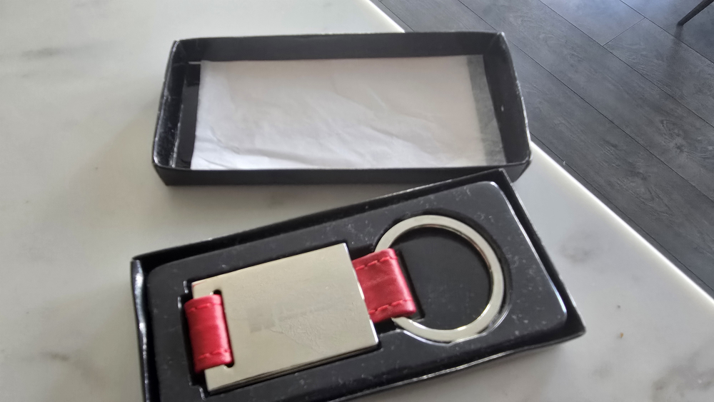 Keyring with a metallic plate and red strap. Comes with a box. It's perfect to keep your keys organized and easily accessible, bringing a sense of calm.