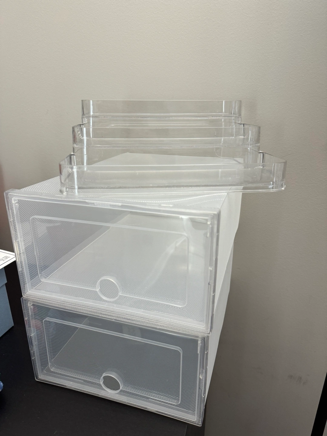 Stackable storage boxes. Made of clear plastic. Drawers slide out easily. Great for storing shoes in an organized way. Shoe box 6 for 3$, acrylic stand 2
