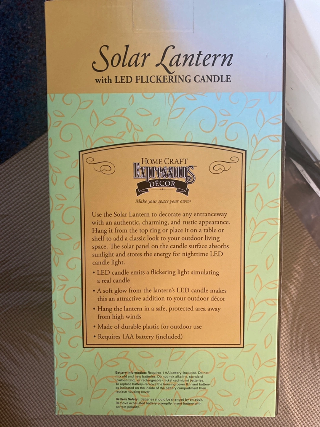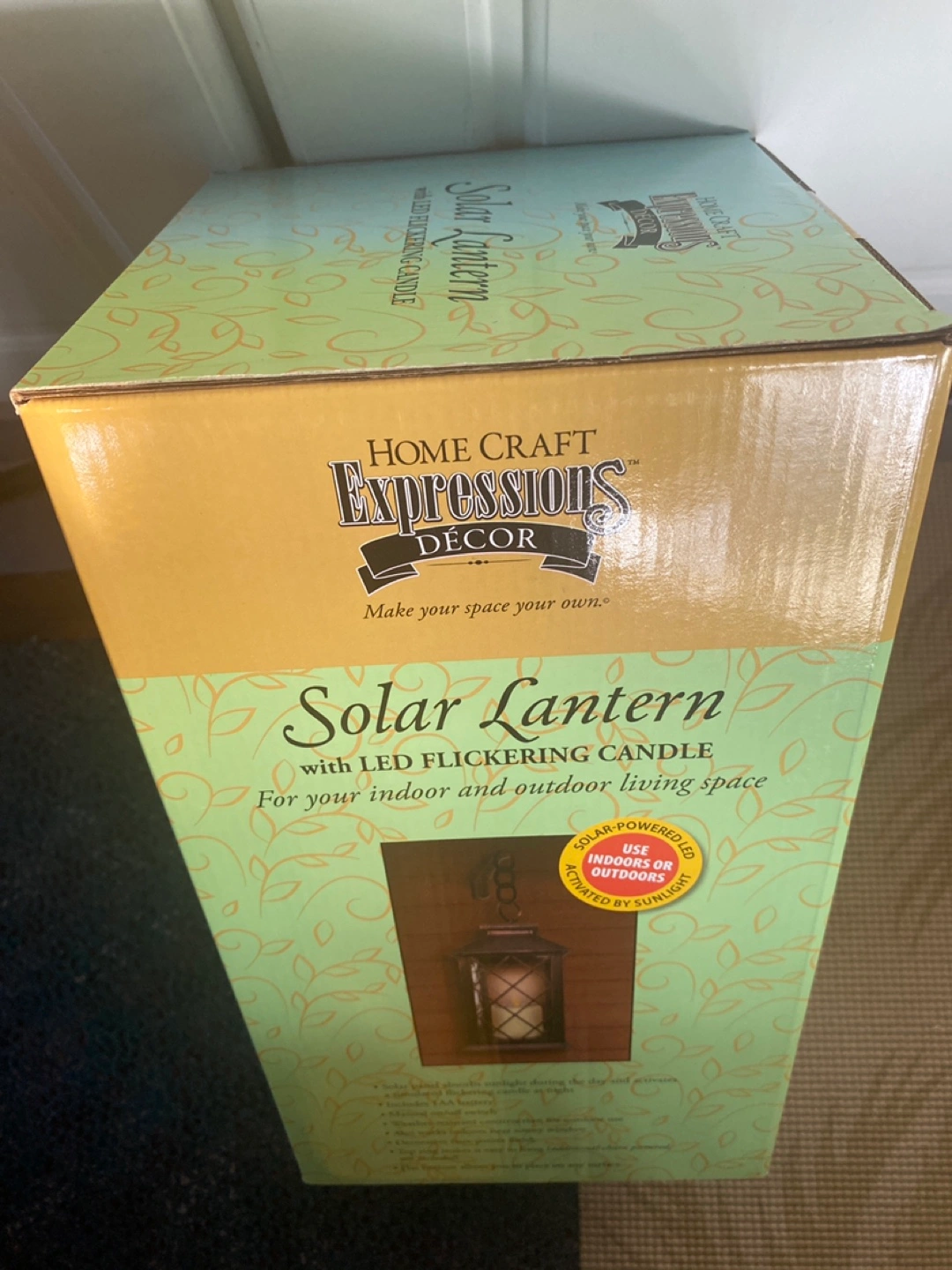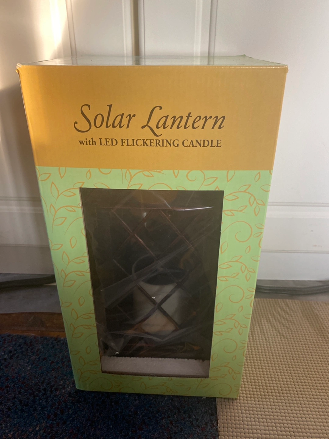 Solar lantern with an LED flickering candle. Rectangular box. The box has green and yellow colours and includes batteries. Makes a great ambience for quiet evenings.