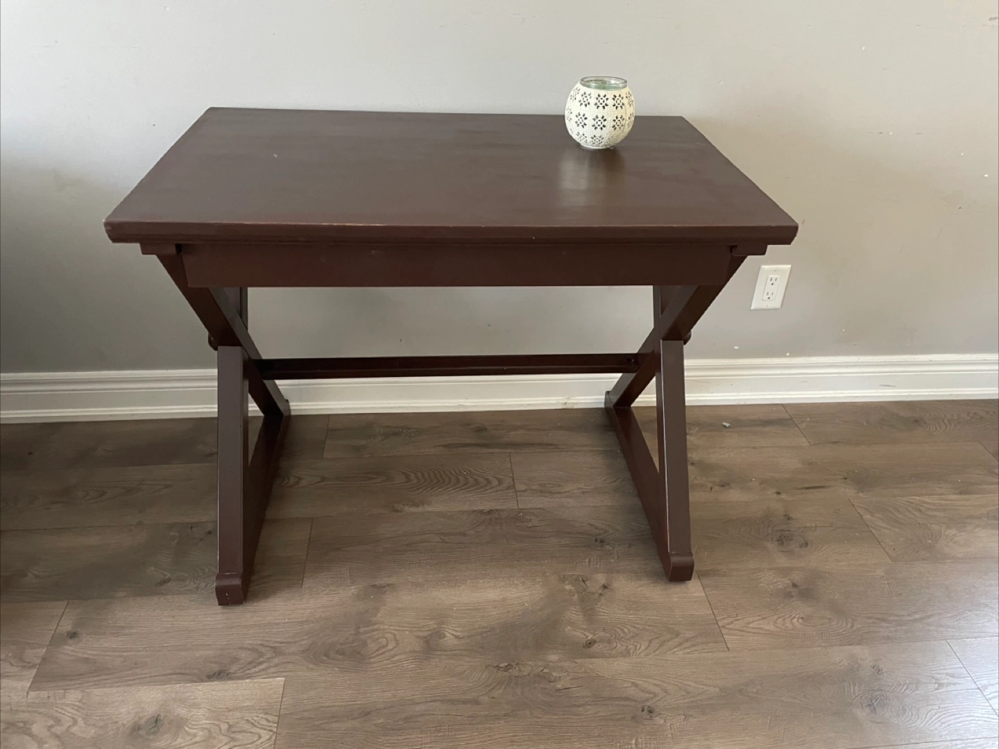 A brown desk /side table. Features a drawer for storage. Has a sturdy X-shaped leg design. This table is perfect for sipping on your morning tea or coffee.