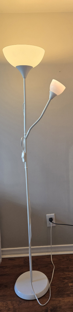 Floor lamp with a reading light. White finish. Dual light design. The suggested price is for the lamp. If you want an extra new bulb, it is $3 dollars. I bought the bulb online, and the delivery fee was way more than the bulb price. Pickup Location: Near Finch Station (Yonge Street)