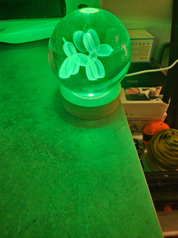 A lovely, colour-changing sphere. Features a balloon dog shape inside. Sits on a round wooden base. The soft glow of this item can help you unwind after a long day.