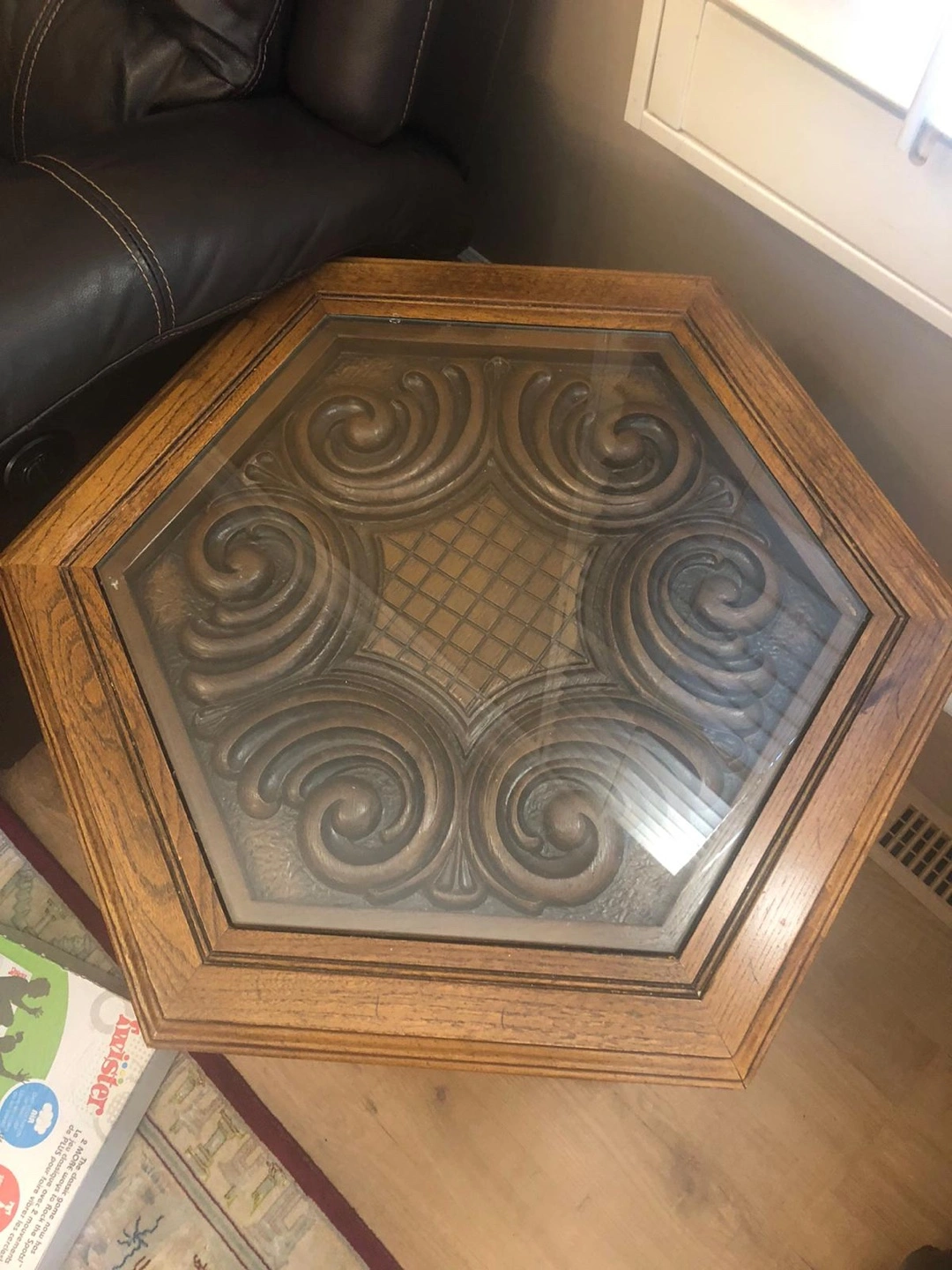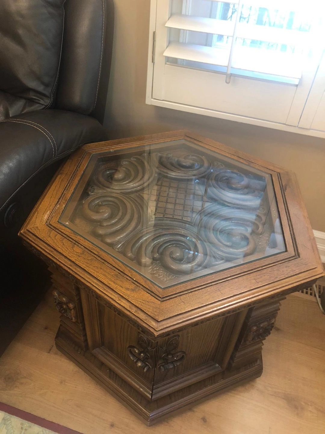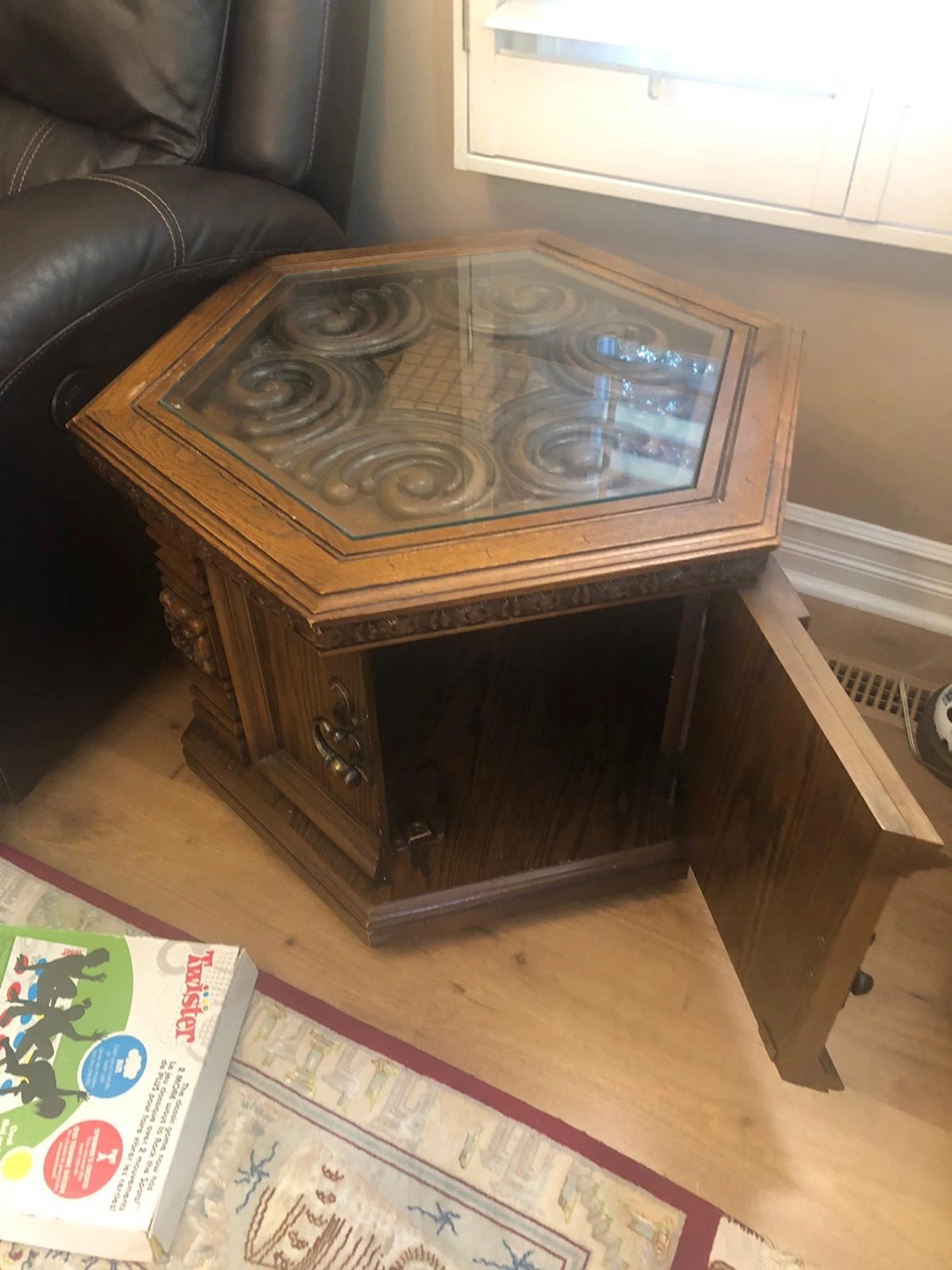 81A beautiful hexagonal side table. Wooden frame with glass top. Detailed carvings on the tabletop and sides. A small storage compartment, with a door that opens.