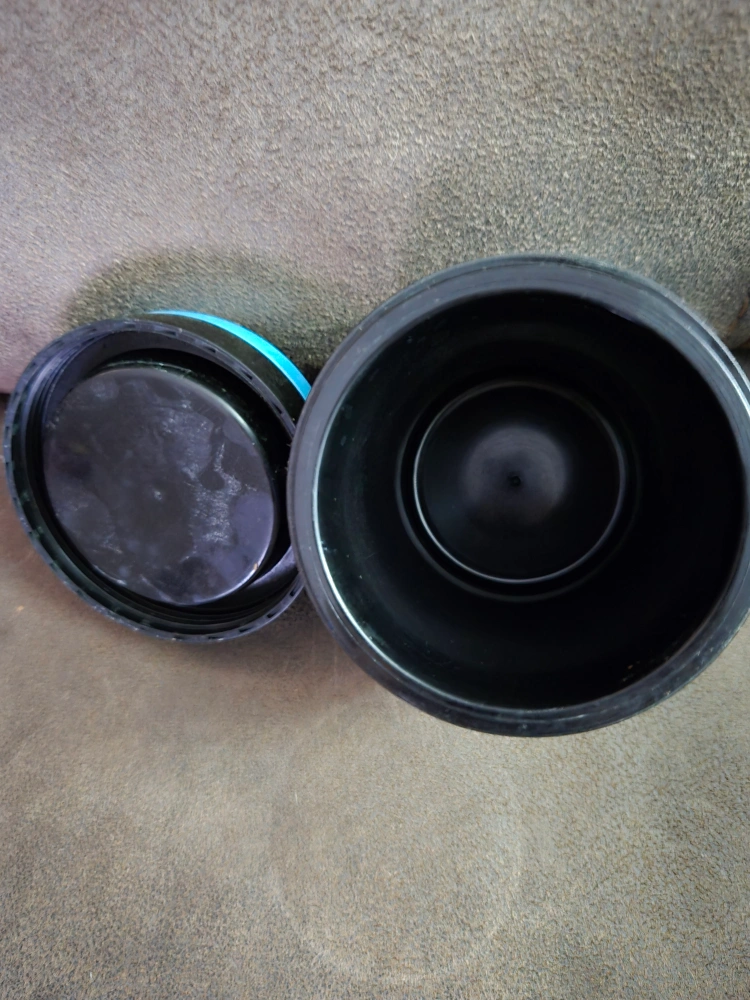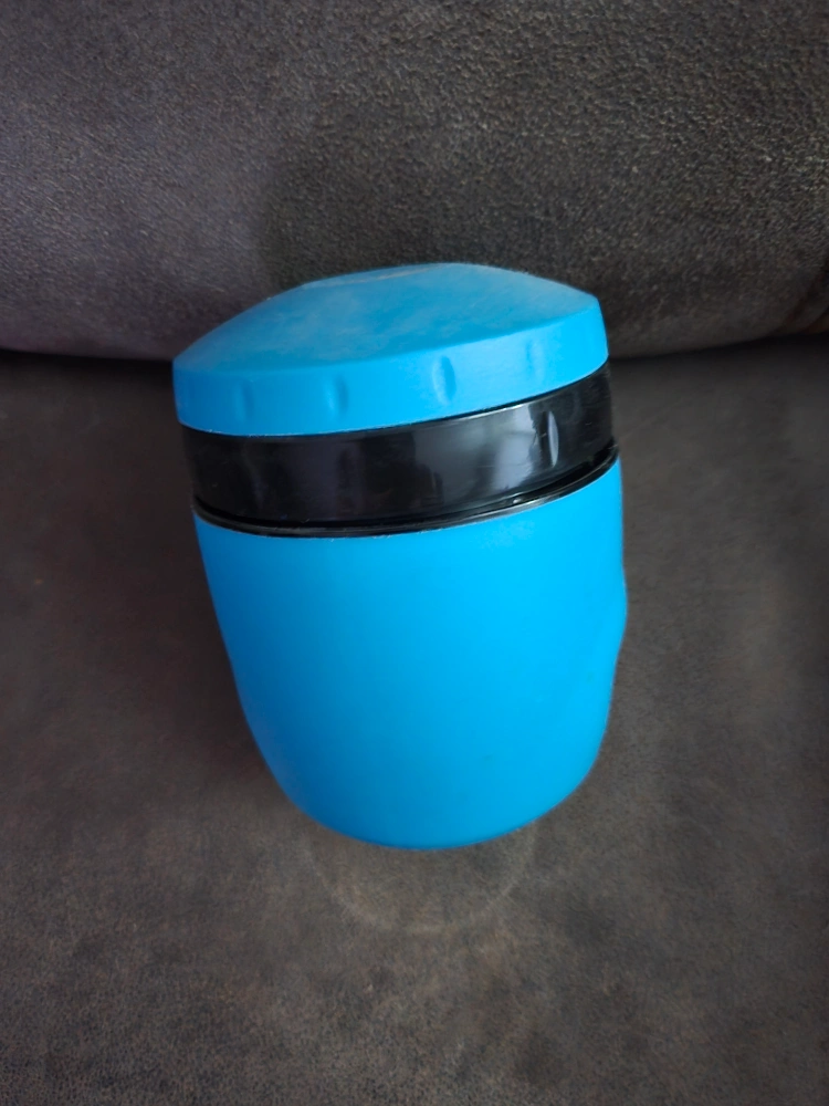 115A vibrant blue and black travel tumbler. It appears to be made from plastic. It comes with a lid. This tumbler would be a great way to take your morning coffee on the go, while keeping it nice and warm.