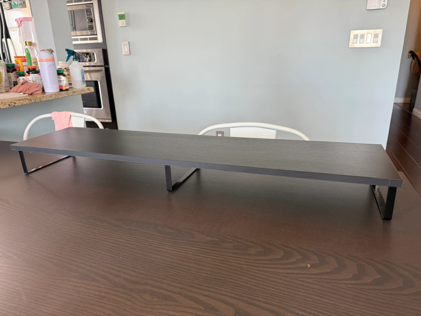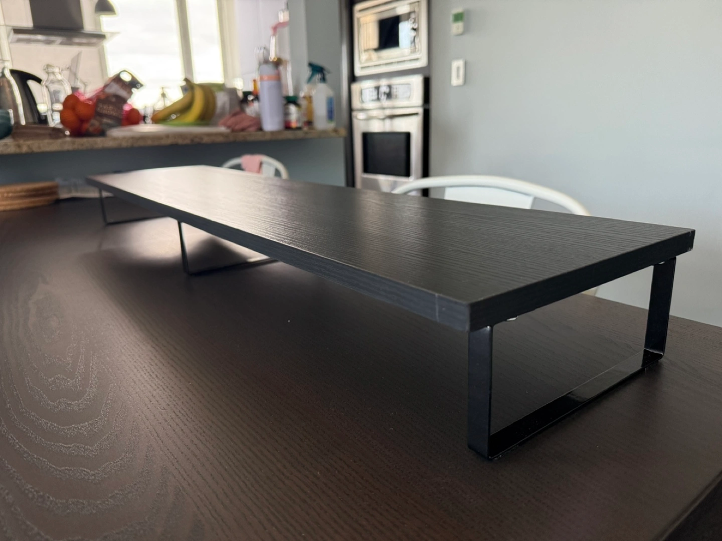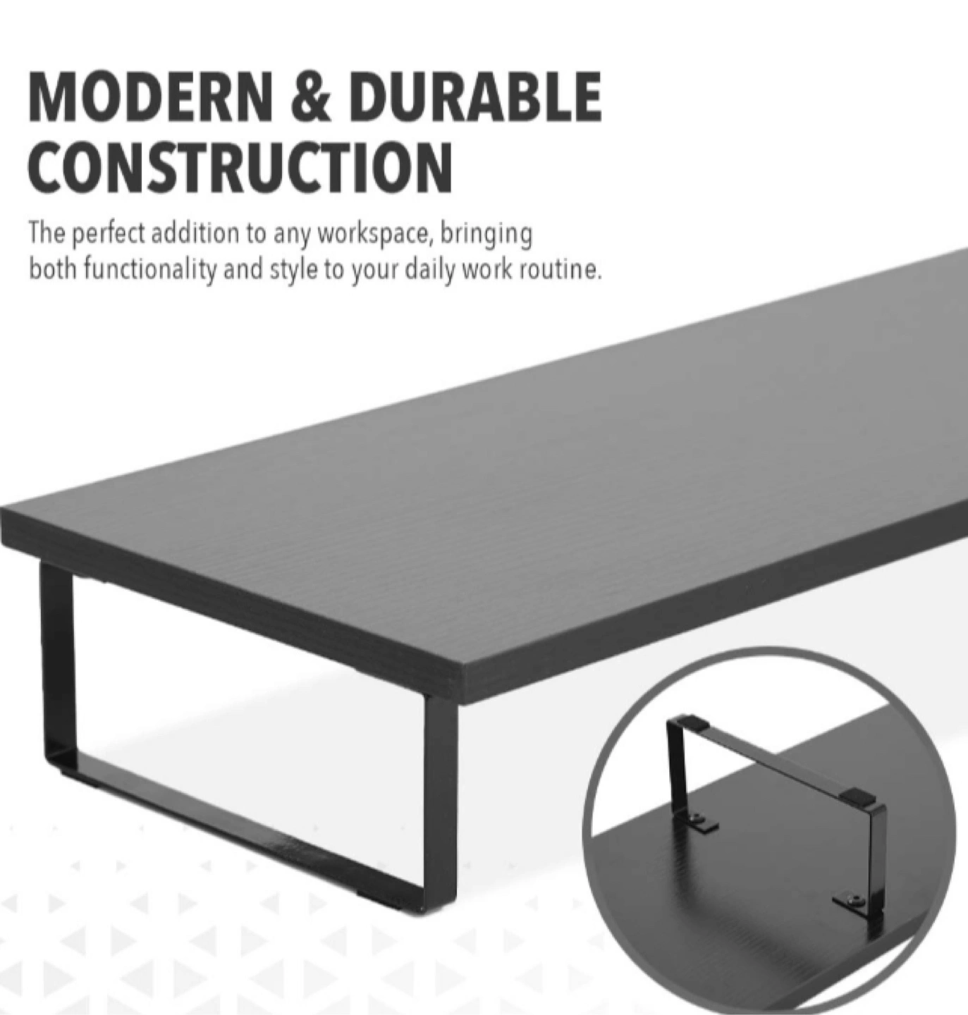 A wooden black monitor riser, can be doubled as a shelf. Supported by black metal frame.