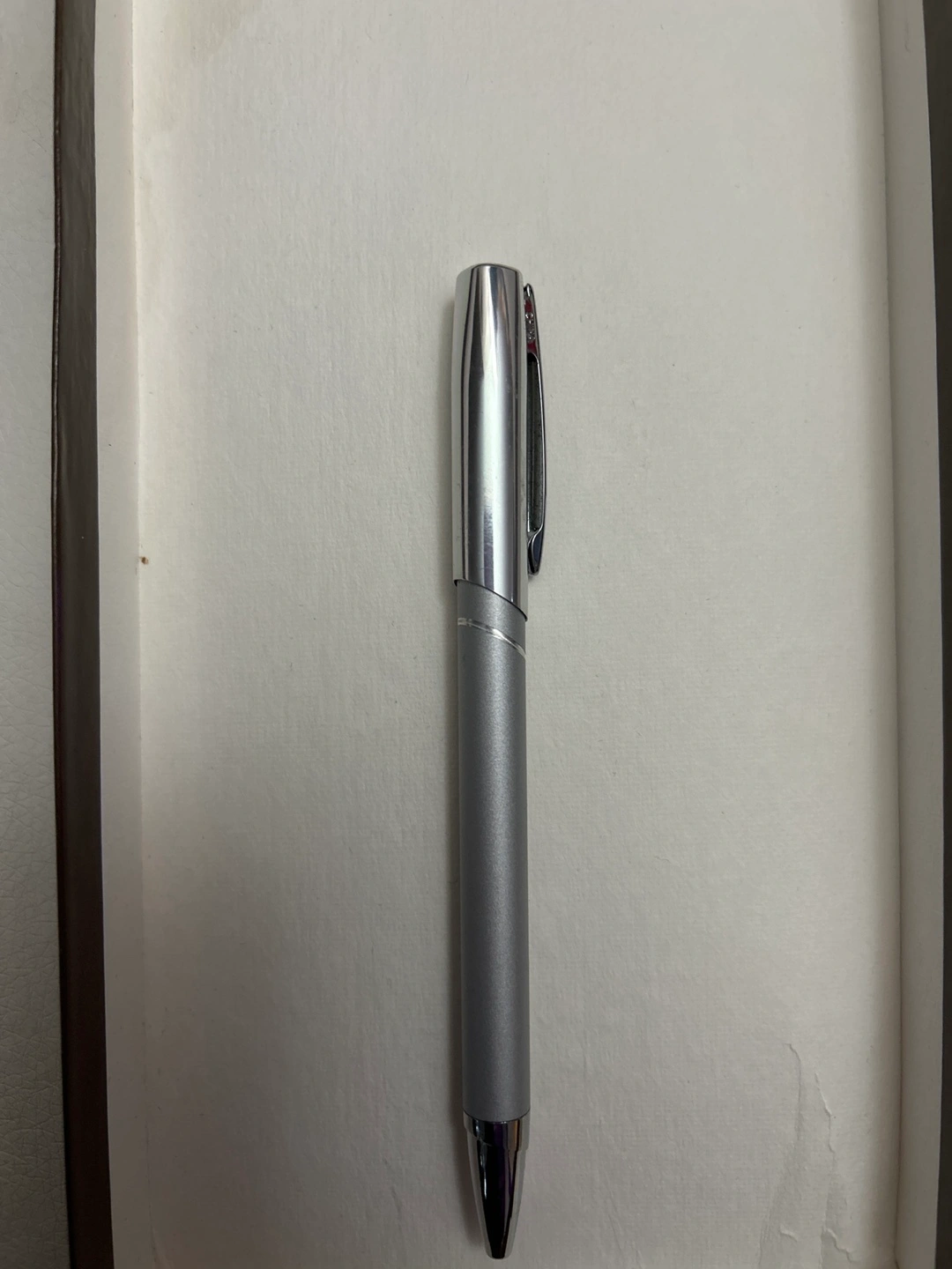 Silver pen with chrome accents. It has a cap and clip. The barrel is a matte silver colour. Writing with this pen can bring a gentle focus to the mind. Never been used