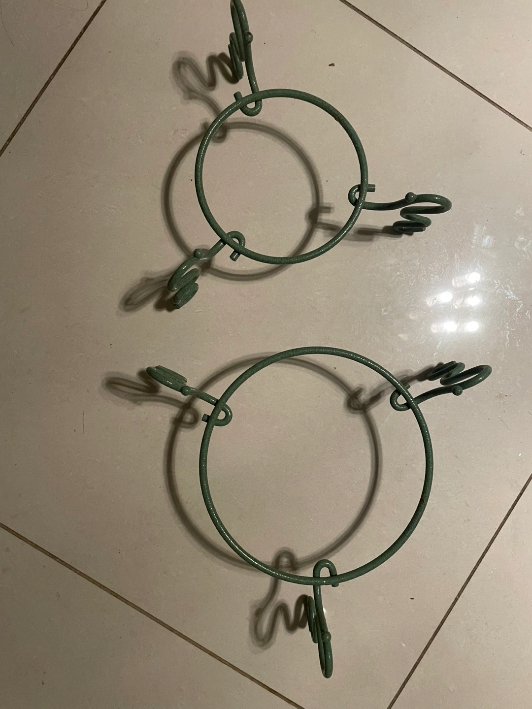 Two metal stands. Green in colour. They have several curly parts and some loops. These stands are great for holding up your Christmas tree for the holidays.