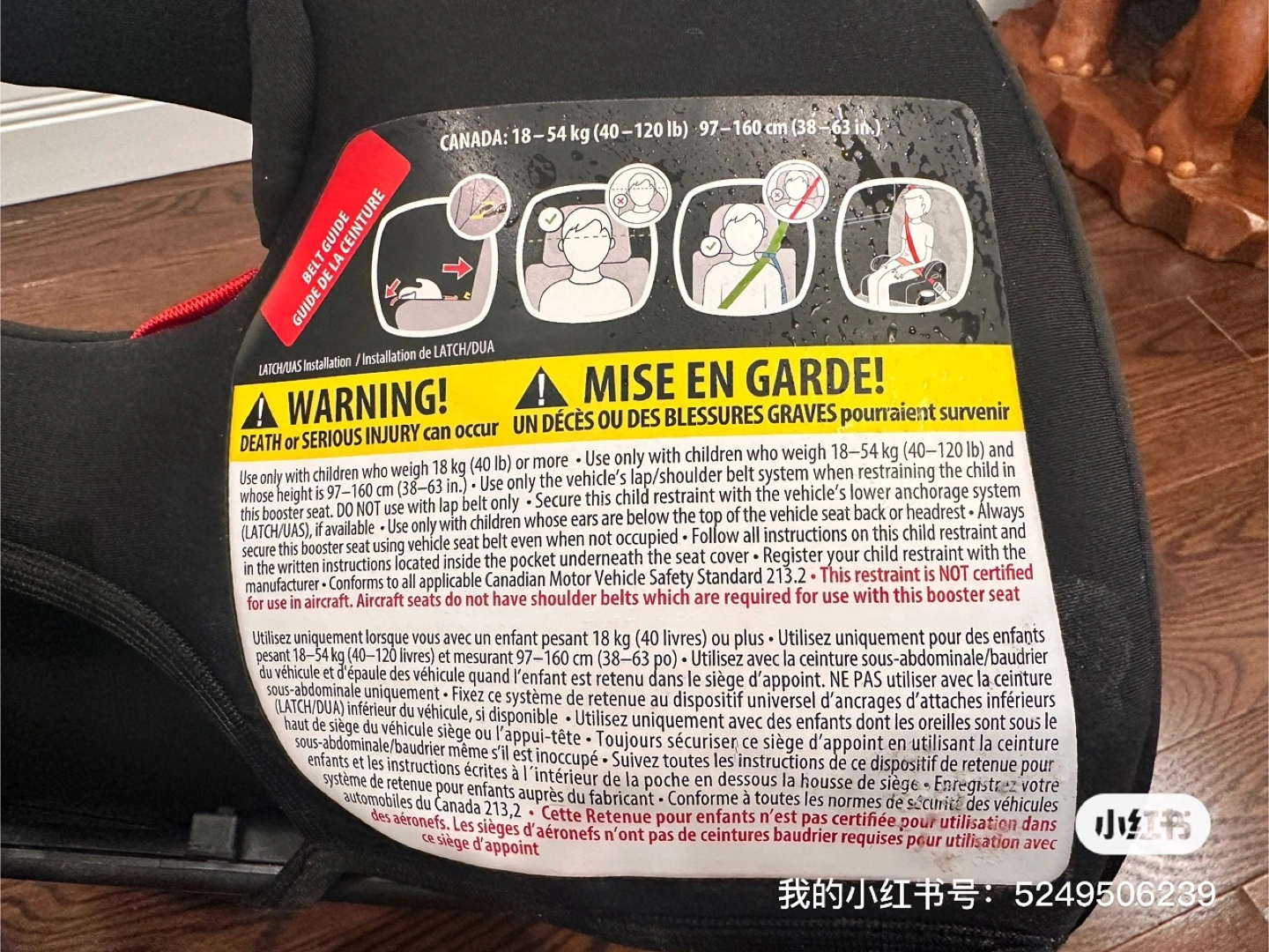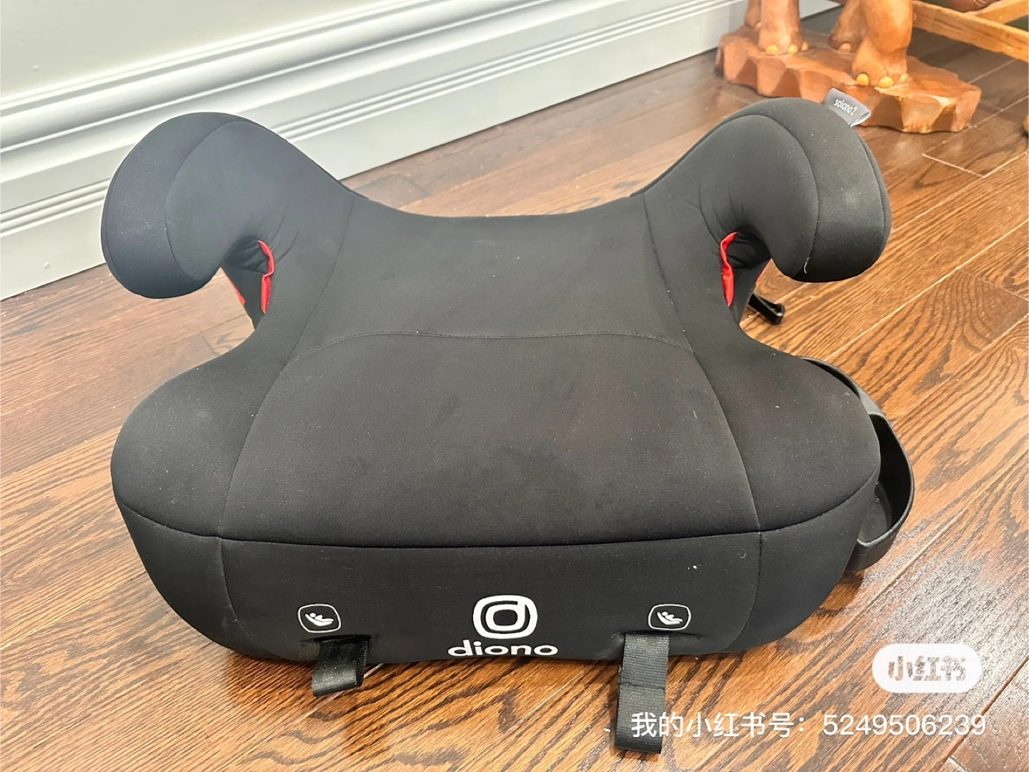 A black booster seat. Features headrests on each side. There are some red accents and a safety strap. A great item to make car rides a bit easier.in year 2022