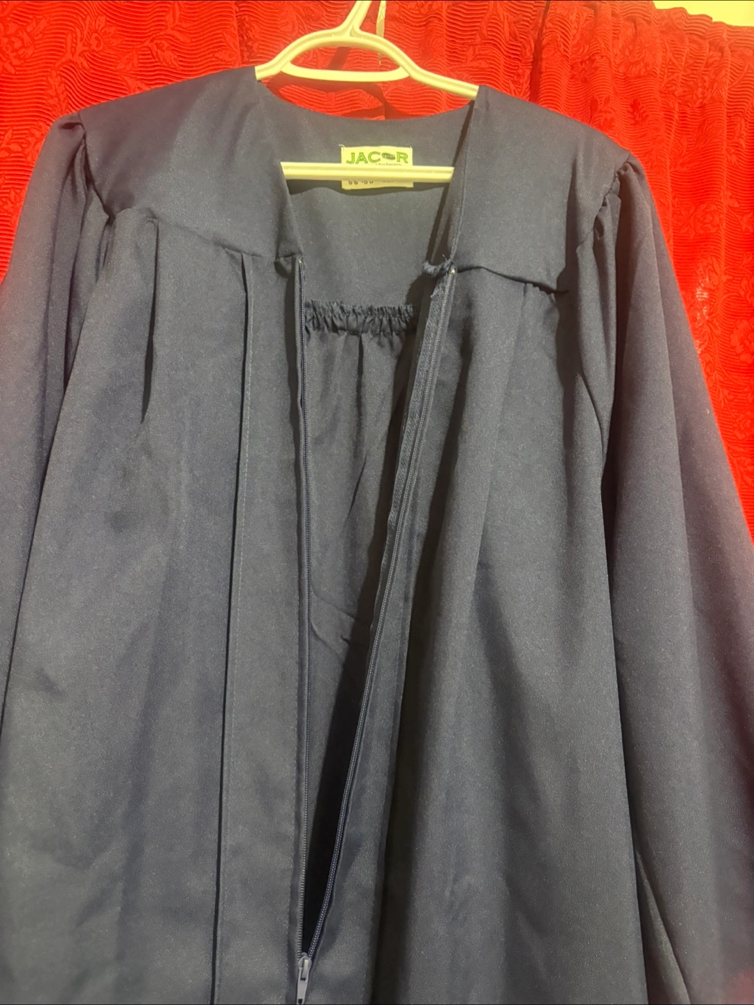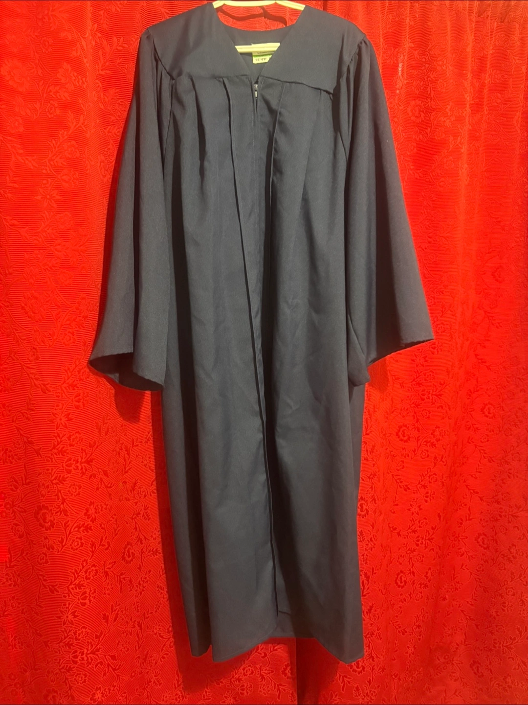 A navy blue graduation gown. Comes with a zipper. The sleeves are loose-fitting. This is a great outfit to wear for those special ceremonies.pick and cash only
