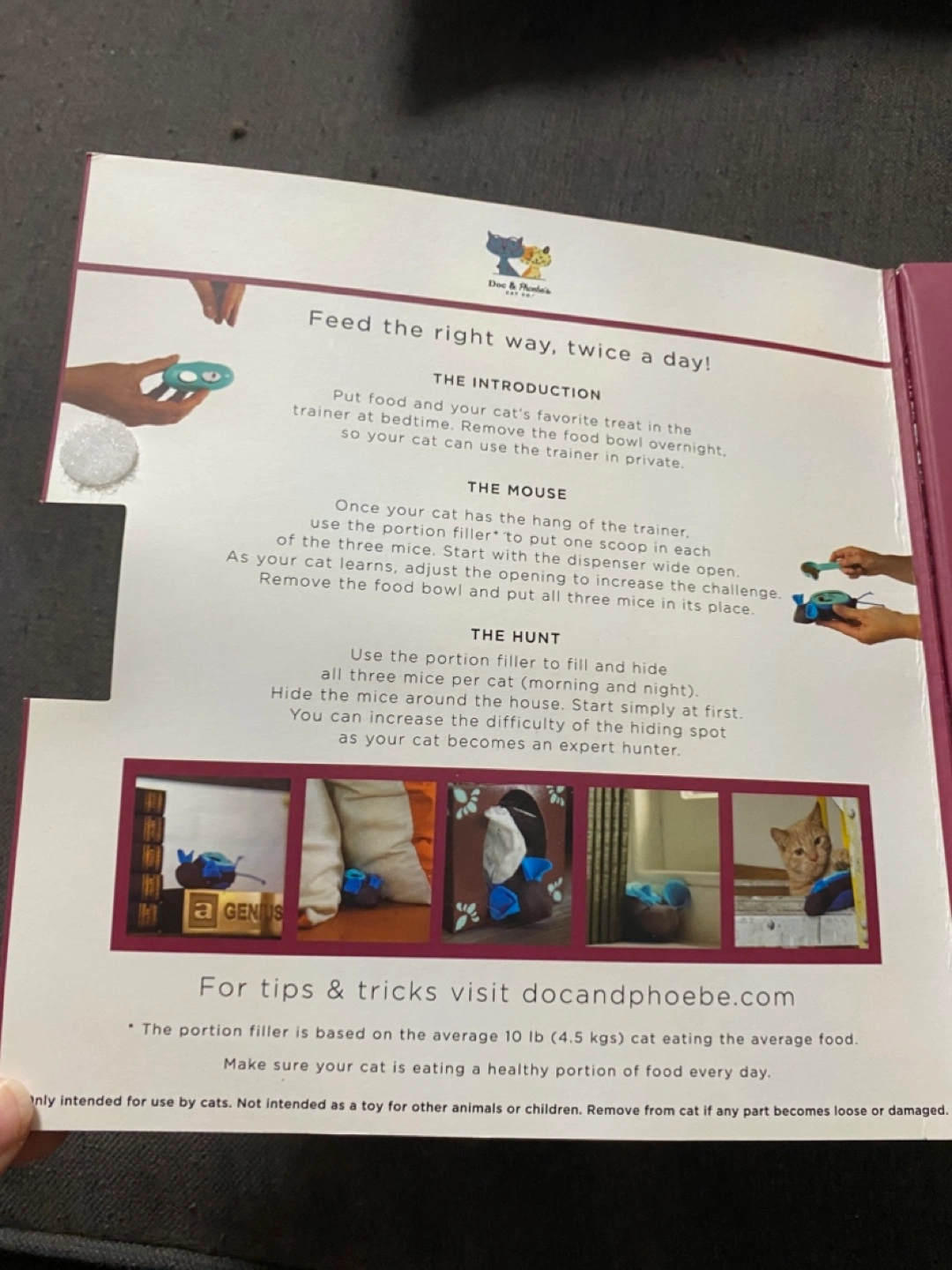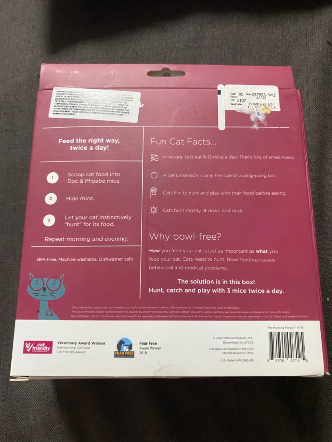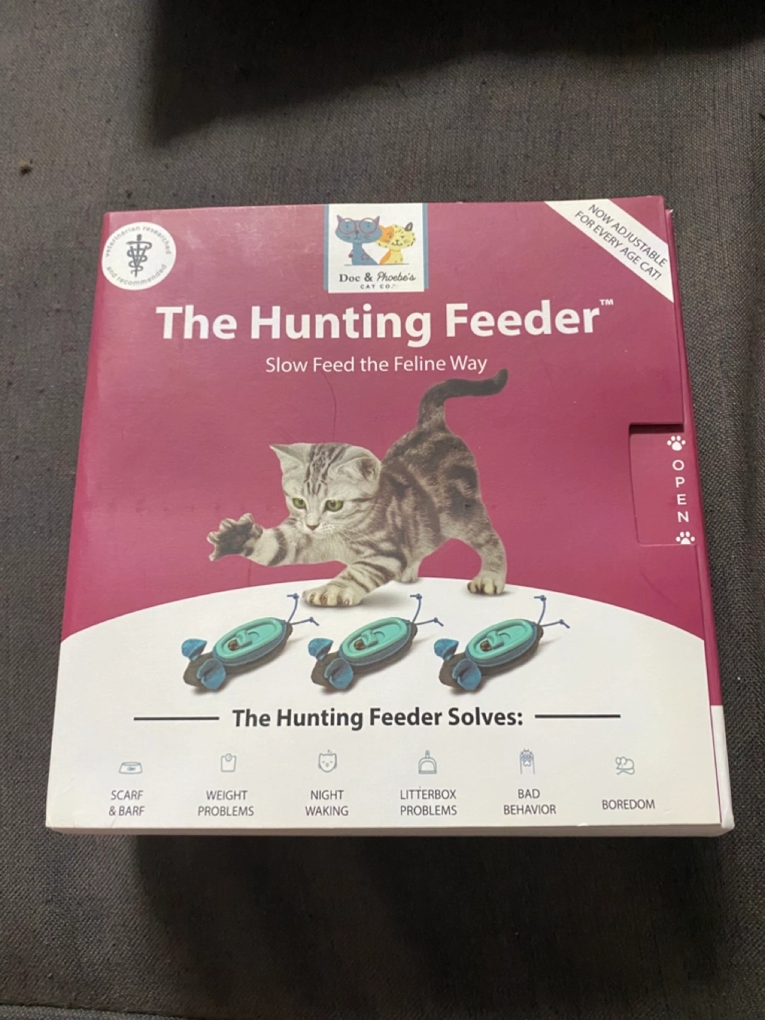 This is a brand new hunting feeder made for cats. The box includes three mice and a portion filler. Perfect for a relaxing and engaging playtime for your cat.