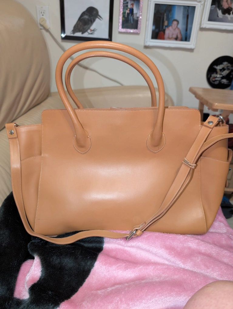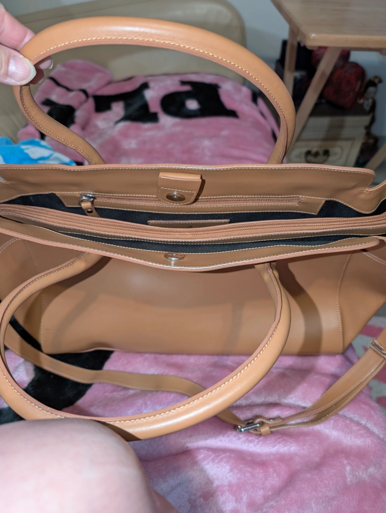 I'm selling a stylish brand new leather handbag. It features two handles and an additional shoulder strap. The interior has multiple compartments and zippers for organization. This handbag can add a touch of elegance to any outfit, and is perfect for everyday use.