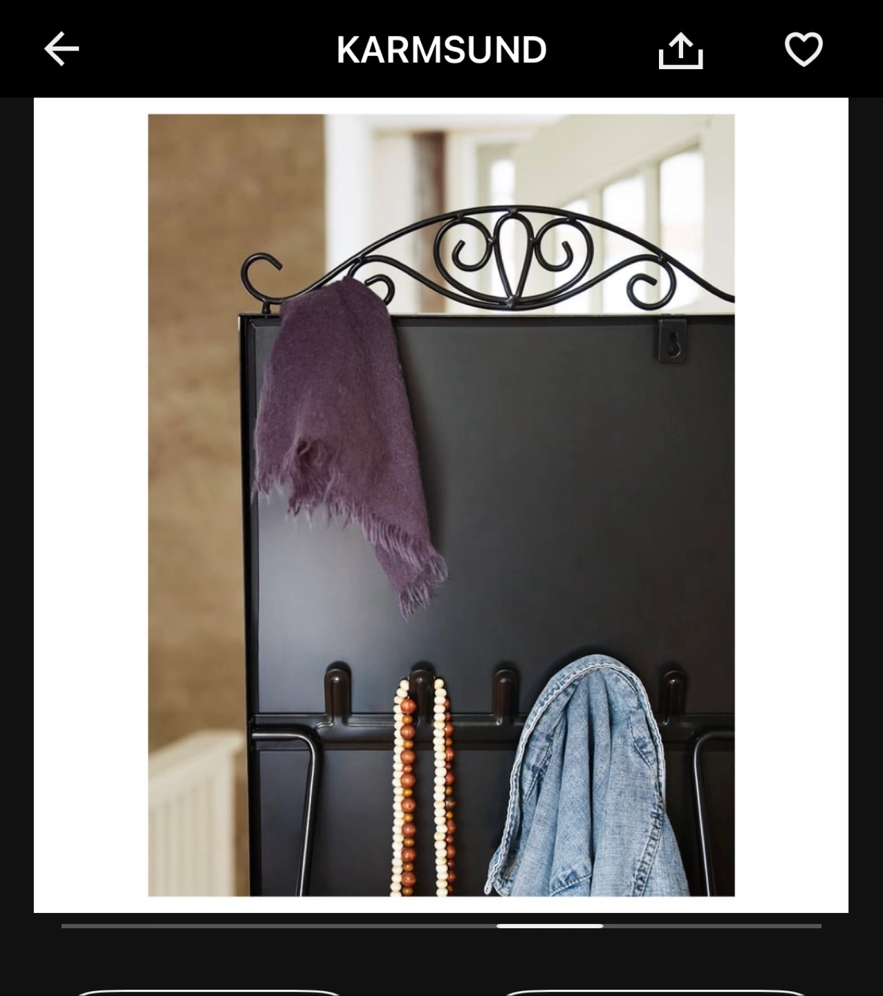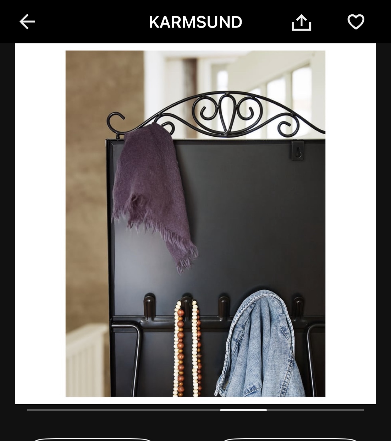 Mirror with a black metal frame. Supported by a stand. Hanging rock at back side for accessories.