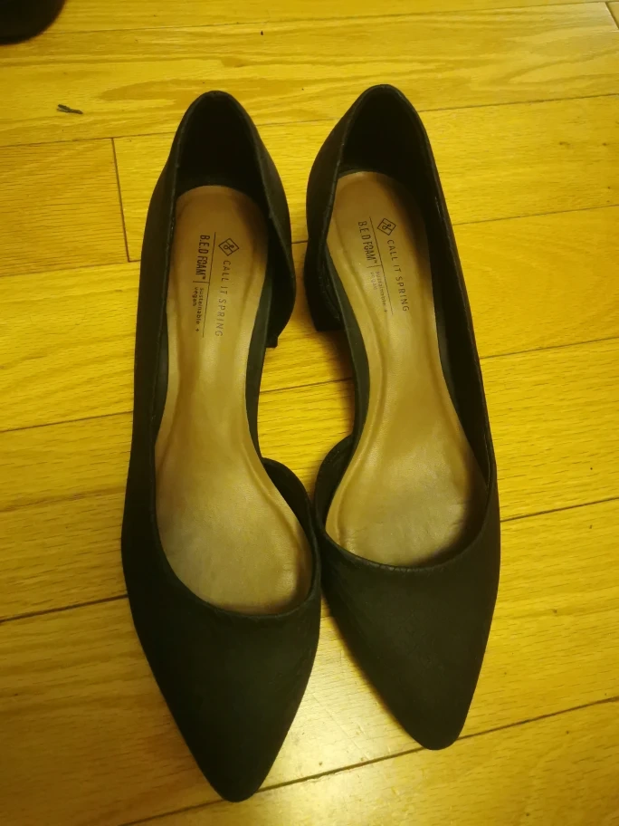 A pair of black flats. Pointed toe design. A slip-on style. Perfect for a day out at the shops or just for a stroll.