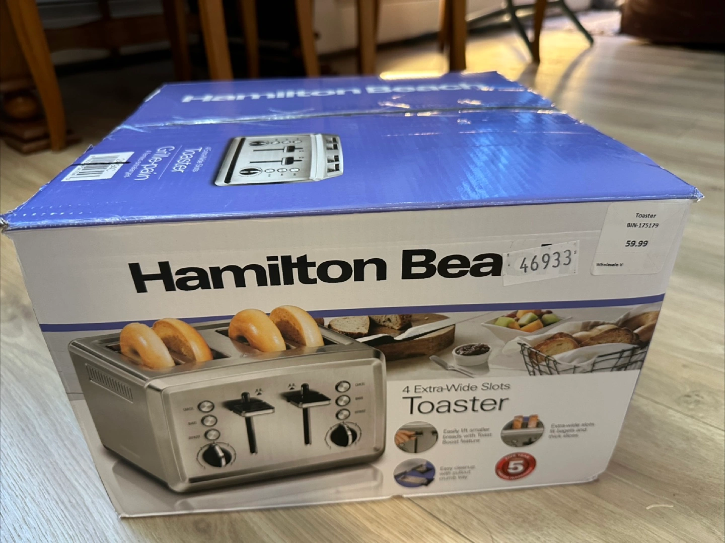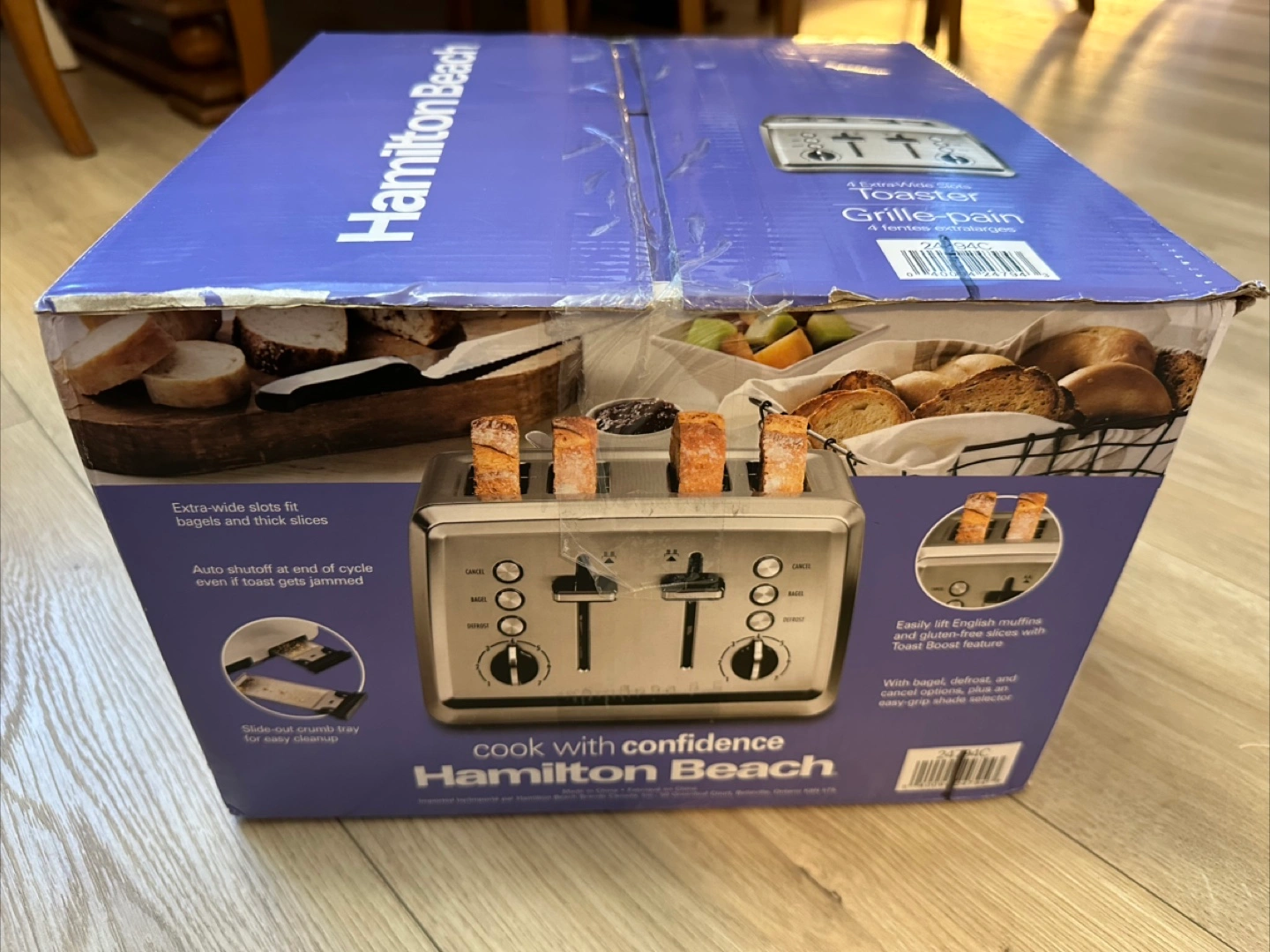 A new Hamilton Beach toaster. Has extra-wide slots, lift features, and slide-out crumb tray. Perfect for enjoying a quick and easy breakfast every morning.