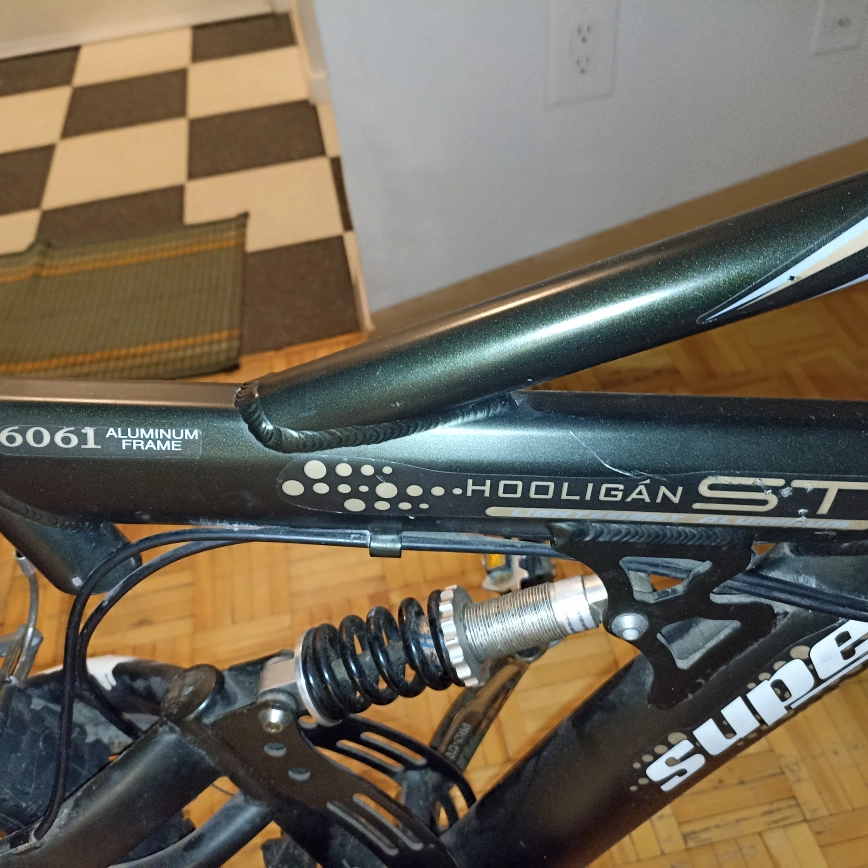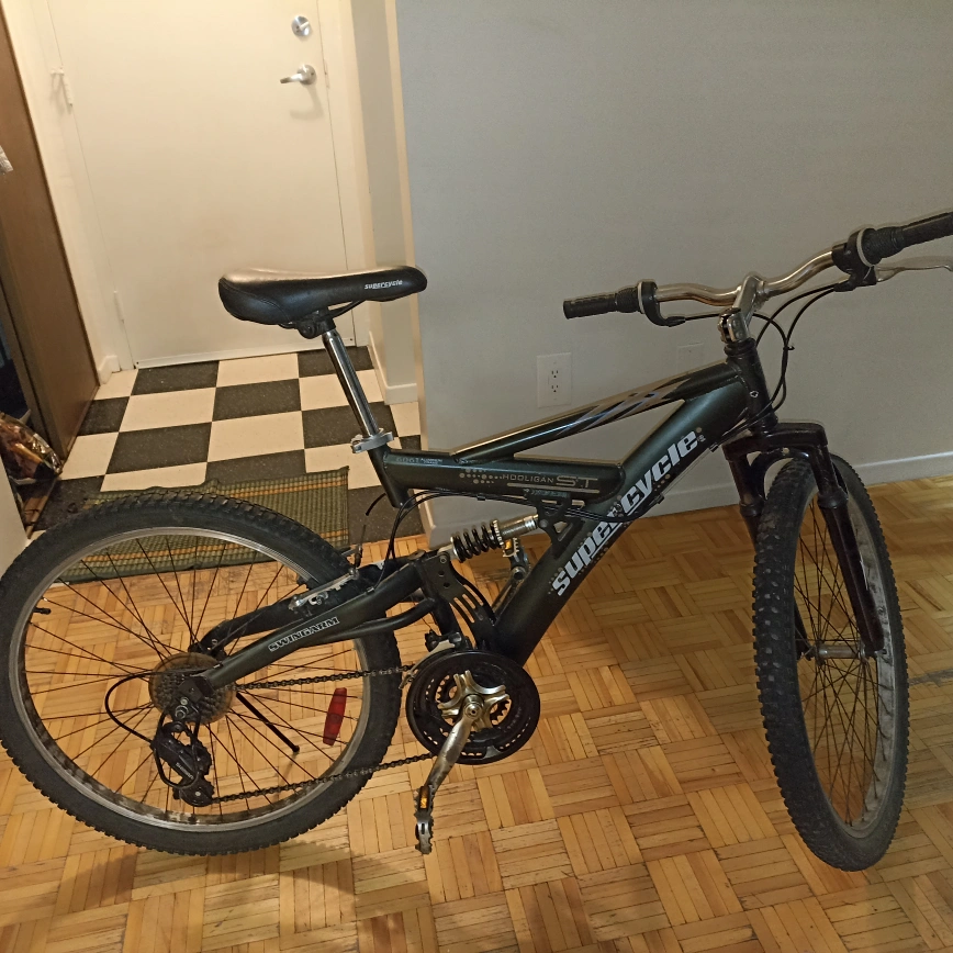 ‼️Moving sale‼️ - Used Supercycle Hooligan Full Suspension mountain bike, 26-inch wheels. lightweight aluminum Supercycle Hooligan Full Suspension Mountain Bike with 18" (45.72 cm) aluminum frame, 26\" (66 cm) tires 21-speed Microshift grip shifters Alloy V-brakes Suspension fork Alloy rims The Supercycle Hooligan 26" Full Suspension Mountain Bike features legendary dual suspension with a downhill fork. The Hooligan has conquered every bit of terrain you can throw at it. Its main feature is an aluminum frame and double-crown downhill style fork and, when combined with its wider size tires, alloy "V" brakes and Shimano derailleurs, the Hooligan is tried, tested, and proven.