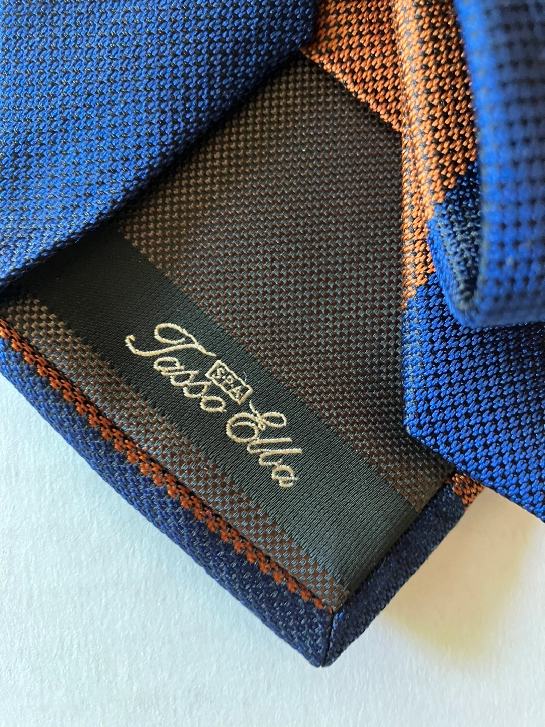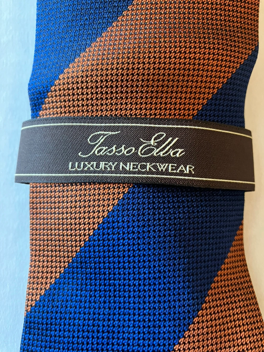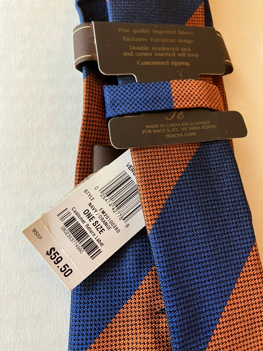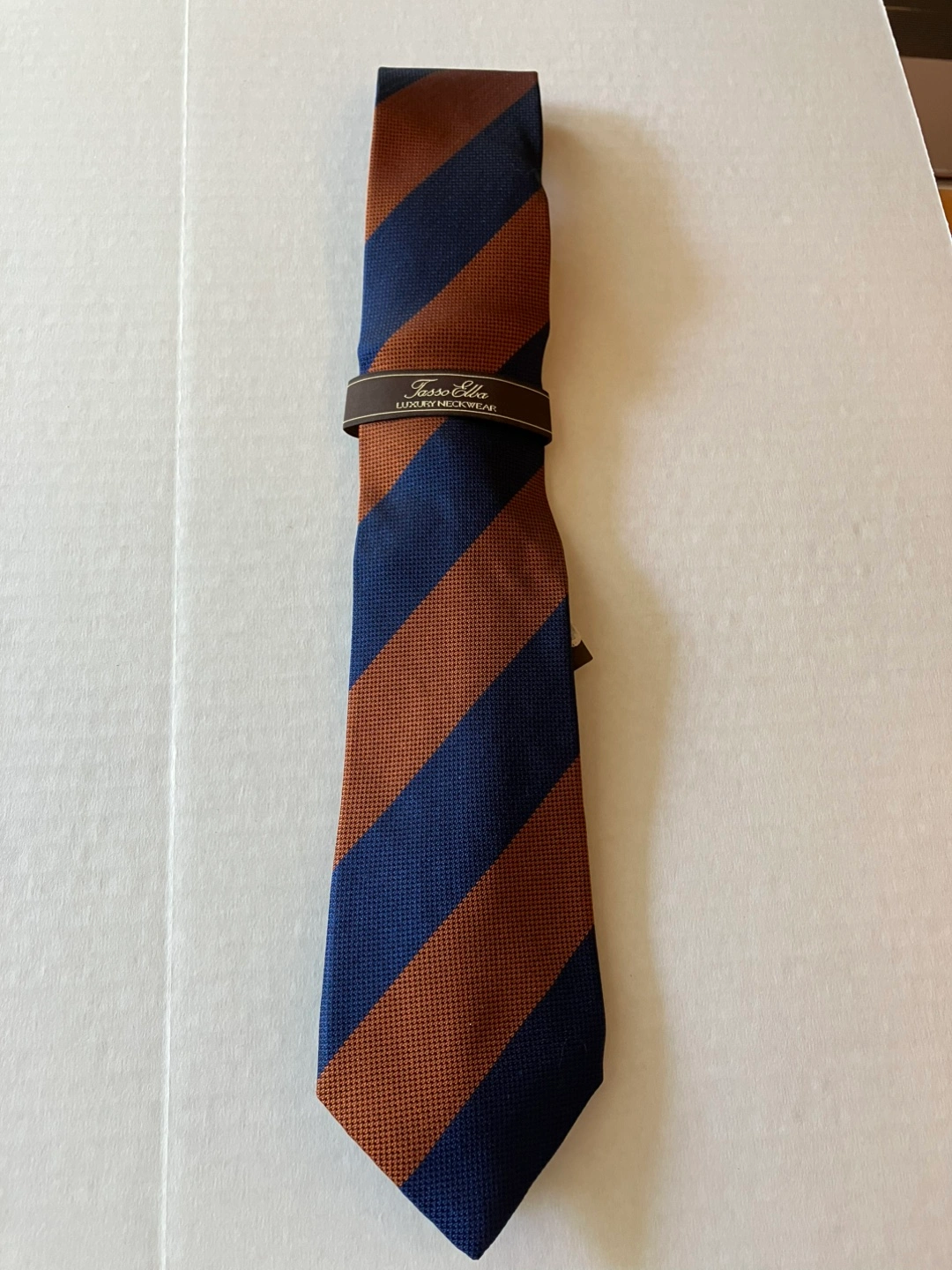 A stylish tie. Features navy and orange stripes. Perfect for adding a touch of sophistication to any outfit, allowing you to feel your most confident and calm self.