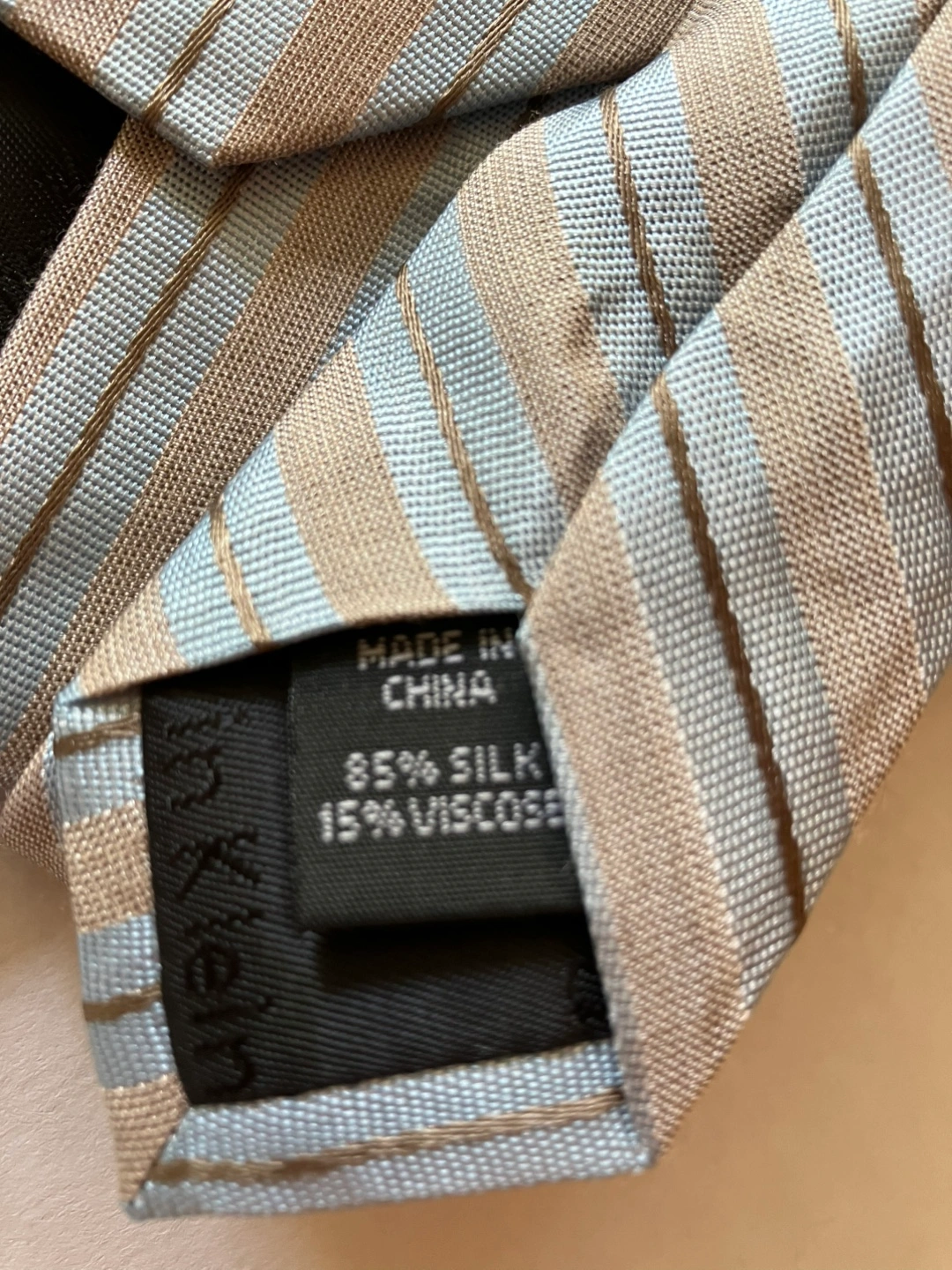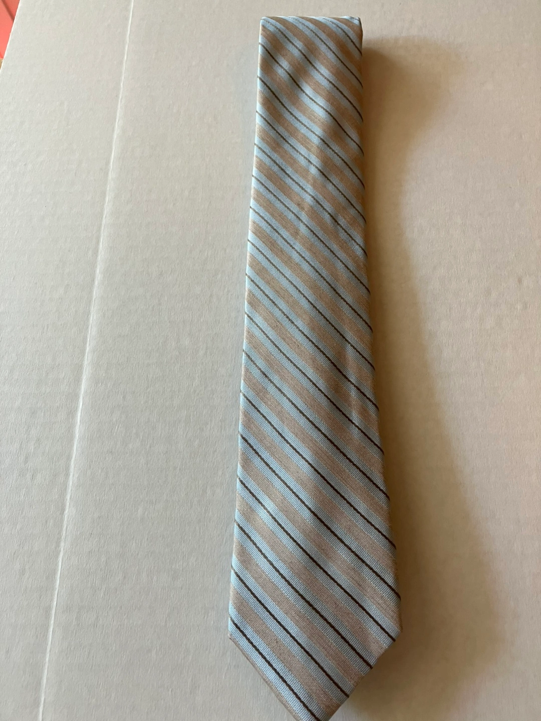 Striped tie in shades of blue and tan. Marked as silk and viscose. Perfect to wear while enjoying a cup of coffee.