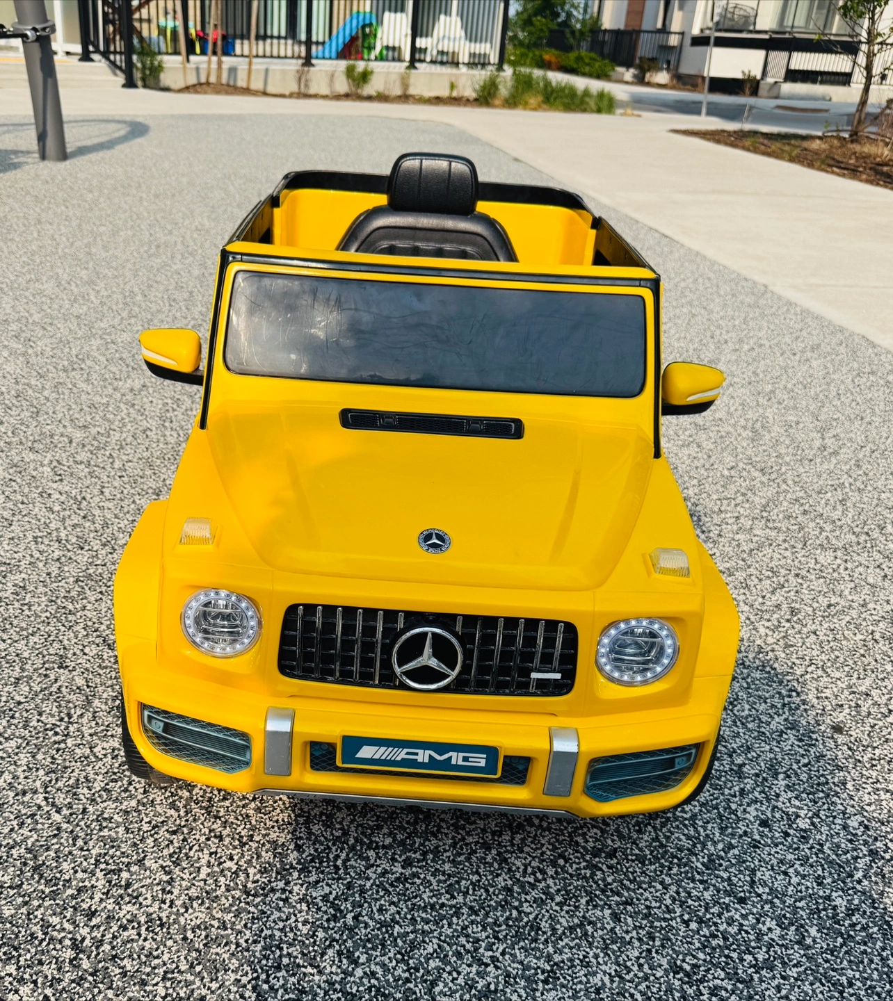 I am selling a yellow toy car, perfect for young drivers. Features include a steering wheel, dashboard details, and a design inspired by a real car. With its bright colour, it is sure to provide hours of fun. One of the back wheels comes off however it is fixable