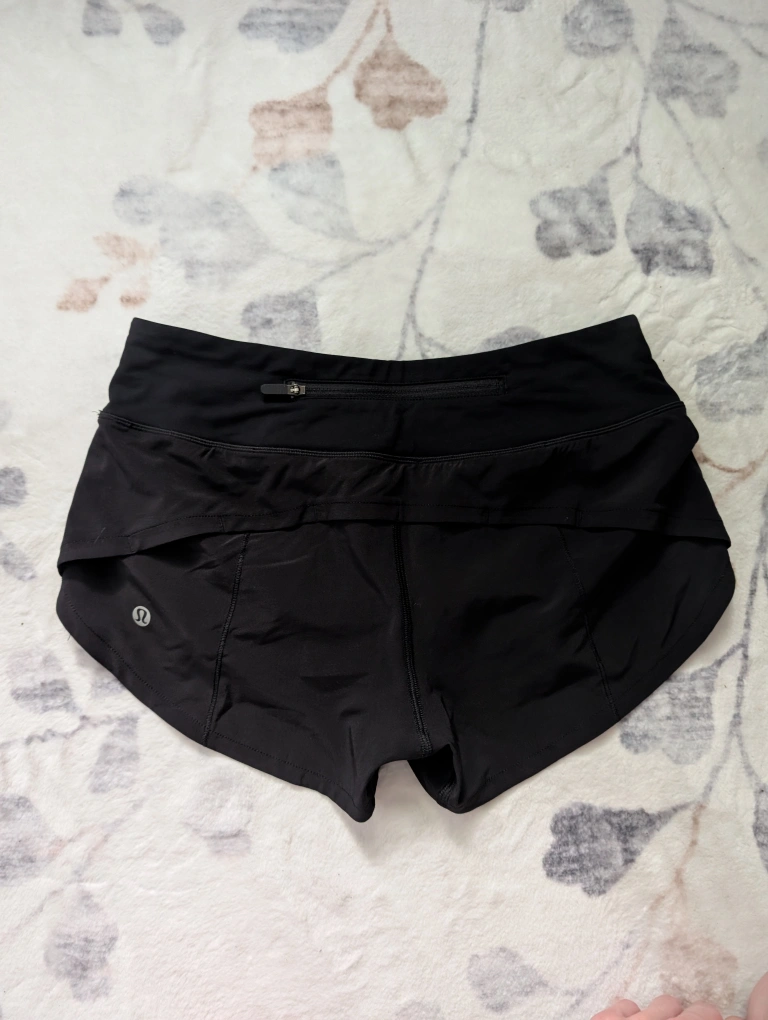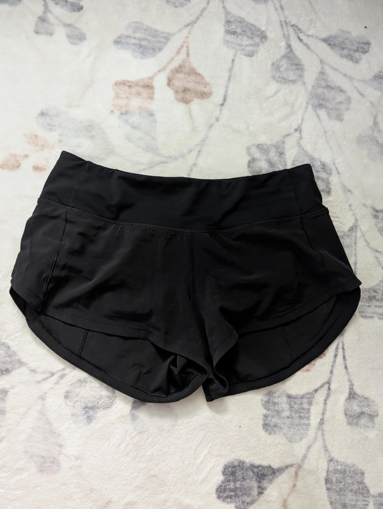 A pair of athletic shorts in black. Features a low rise waistband with a small zipper pocket. Worn only a couple times. Perfect condition.