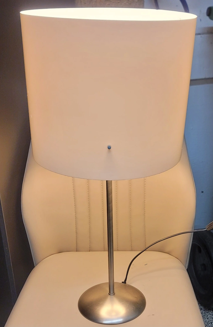 A stylish table lamp. Features a large, cylindrical lampshade. Supported by a slender, metallic base. Would be perfect for creating a cozy atmosphere.
