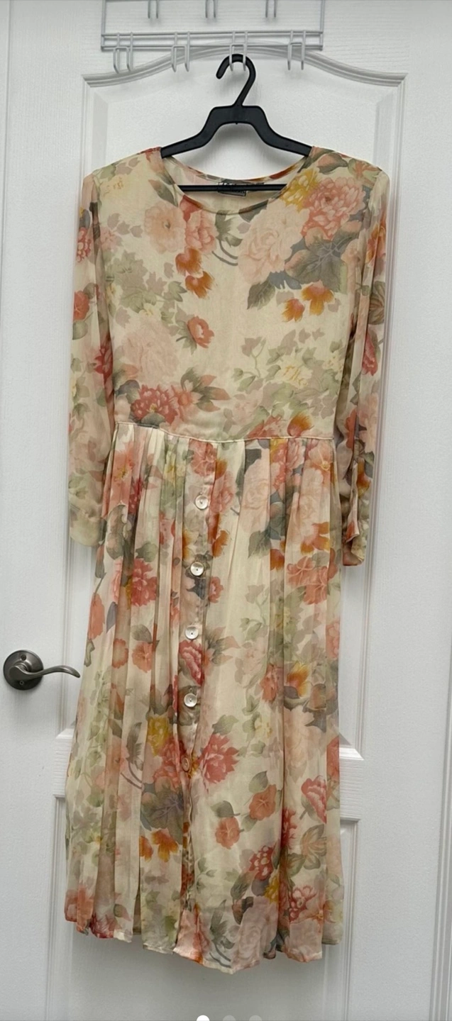 Beautiful long dress with a floral design. Button-up front, with a pleated skirt. Featuring long sleeves. Comes with a tie at the back. Perfect for a lovely day out. Fits breast 37”, waist 36”, dress length 49”