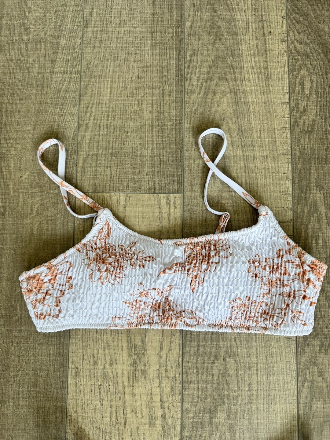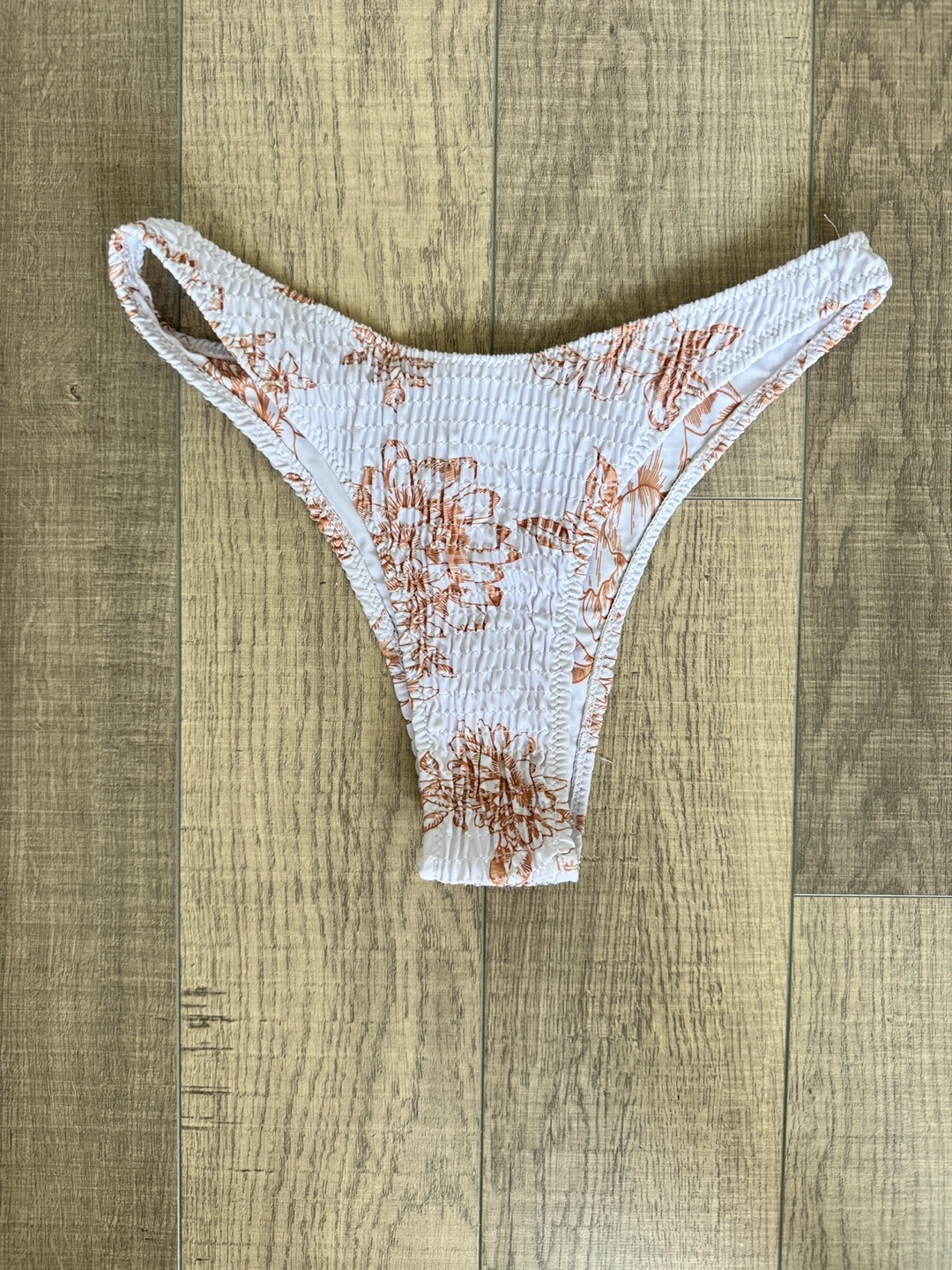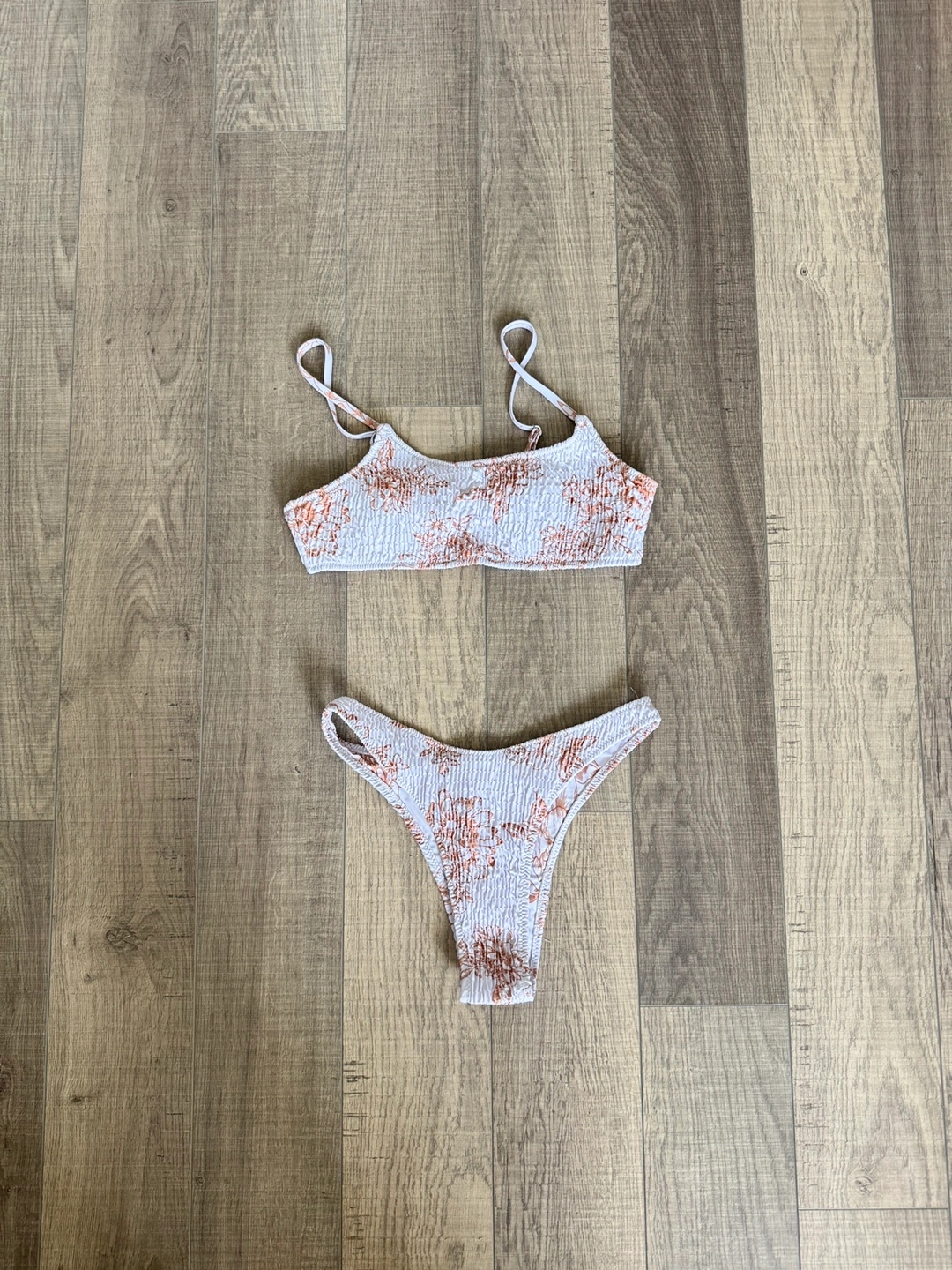 Features a bikini top and matching bottoms. It has a floral pattern. A perfect item for a relaxing day at the beach.