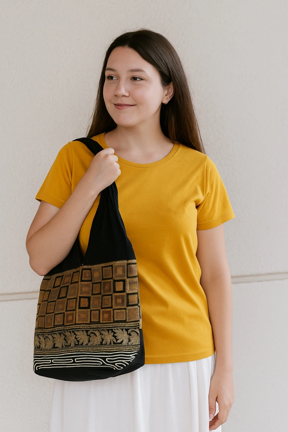 Black Handbag With Ethnic Print