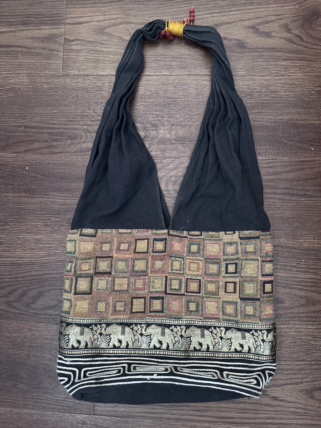 This lovely handbag features a black fabric body and matching straps, and a striking patterned bottom. The pattern incorporates squares, elephants, and a white linear design. It is a beautiful piece to bring with you on your next shopping trip, helping to keep your mind calm and your items secure.