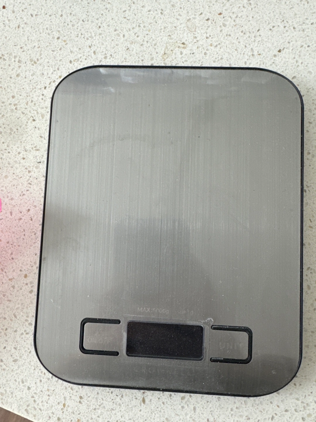 A rectangular digital scale. Made with a silver finish. It features several buttons and a digital display. Perfect for weighing ingredients, bringing peace to the cooking process.