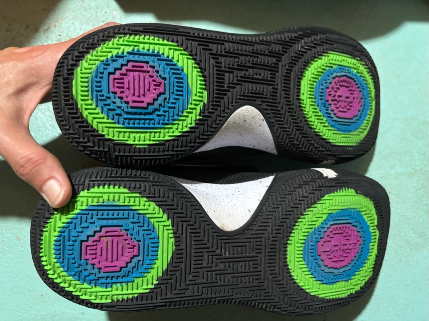 These black basketball shoes offer comfort and support. They have a unique circular colourful design on the sole with a black tread. Worn very few times before suddenly outgrown by shoe collecting teenager