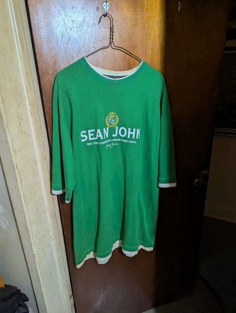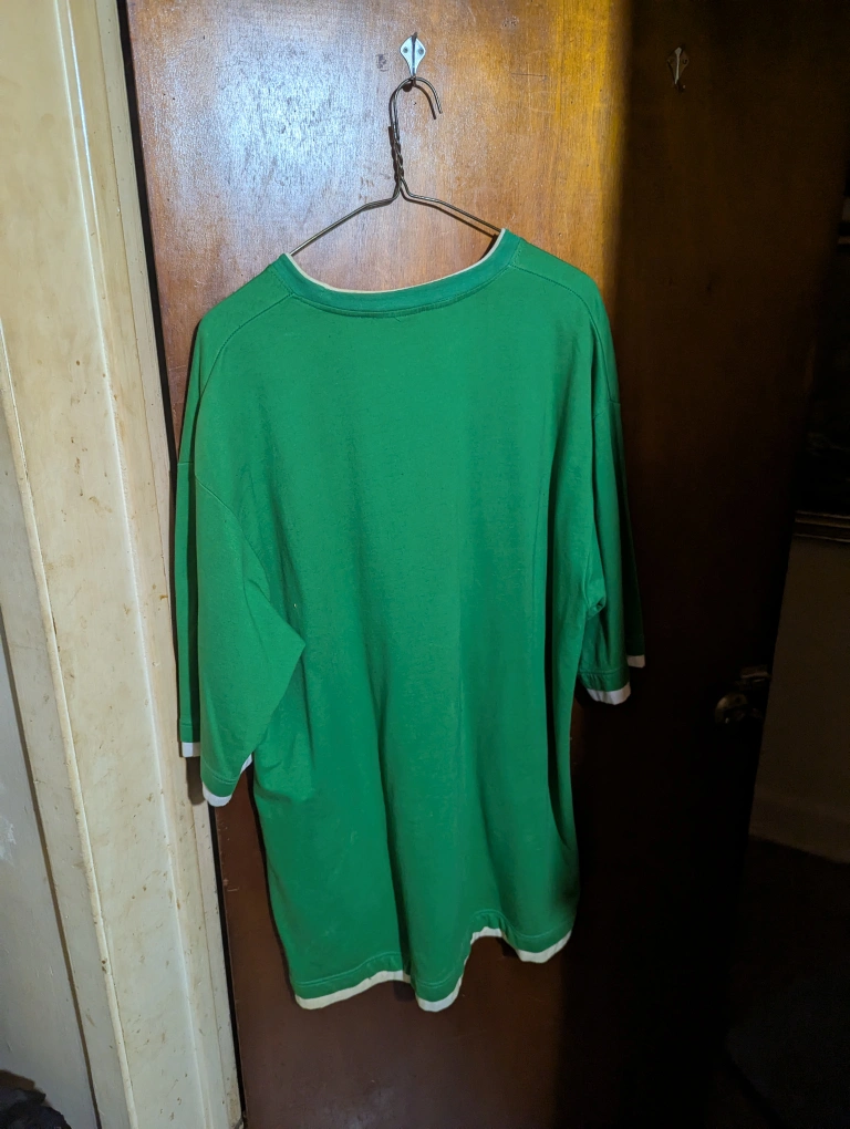 Green t-shirt. Short sleeves with white trim. The shirt has a round neckline. Putting on a comfortable shirt like this one can be a great way to relax after a long day.