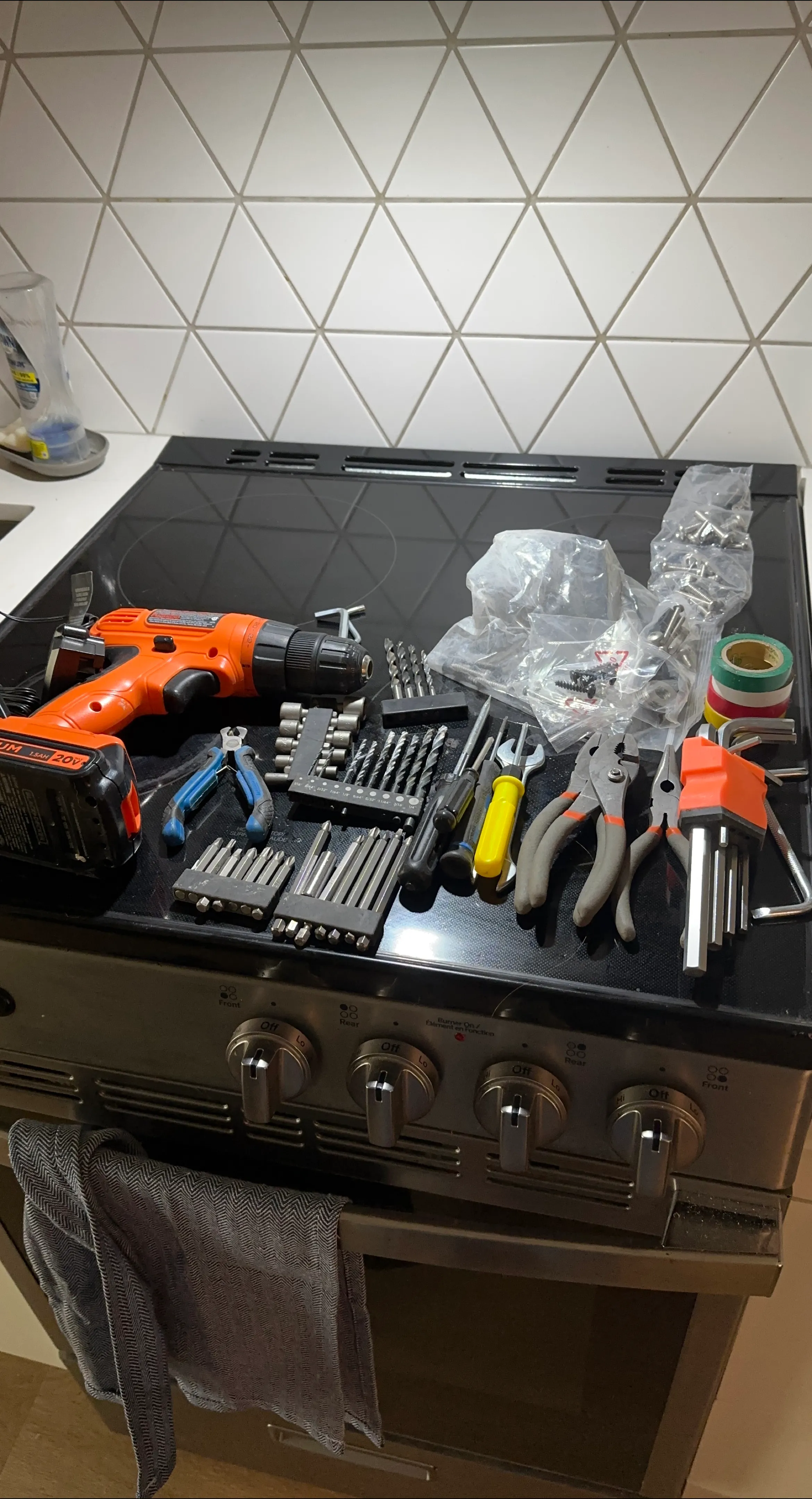 Drill and tools. Included a drill with a battery and charger, assorted bits, pliers, and more. A well-stocked tool kit is always a great thing to have.