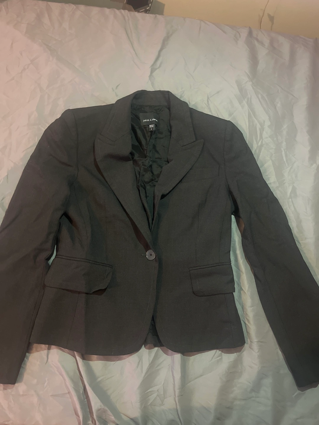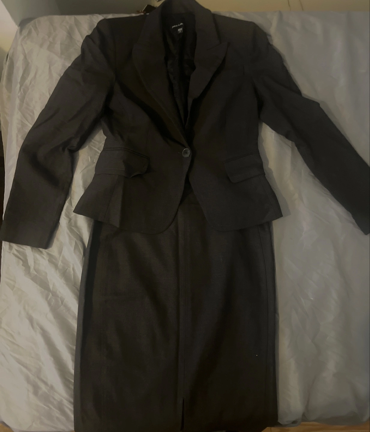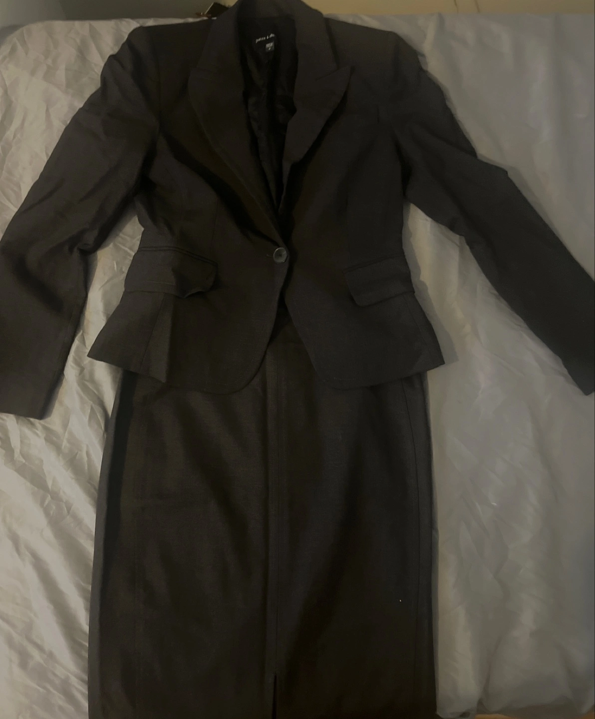 A professional suit set. Includes a blazer and a pencil skirt. A button closure. Perfect for a job interview, so you can look your best.