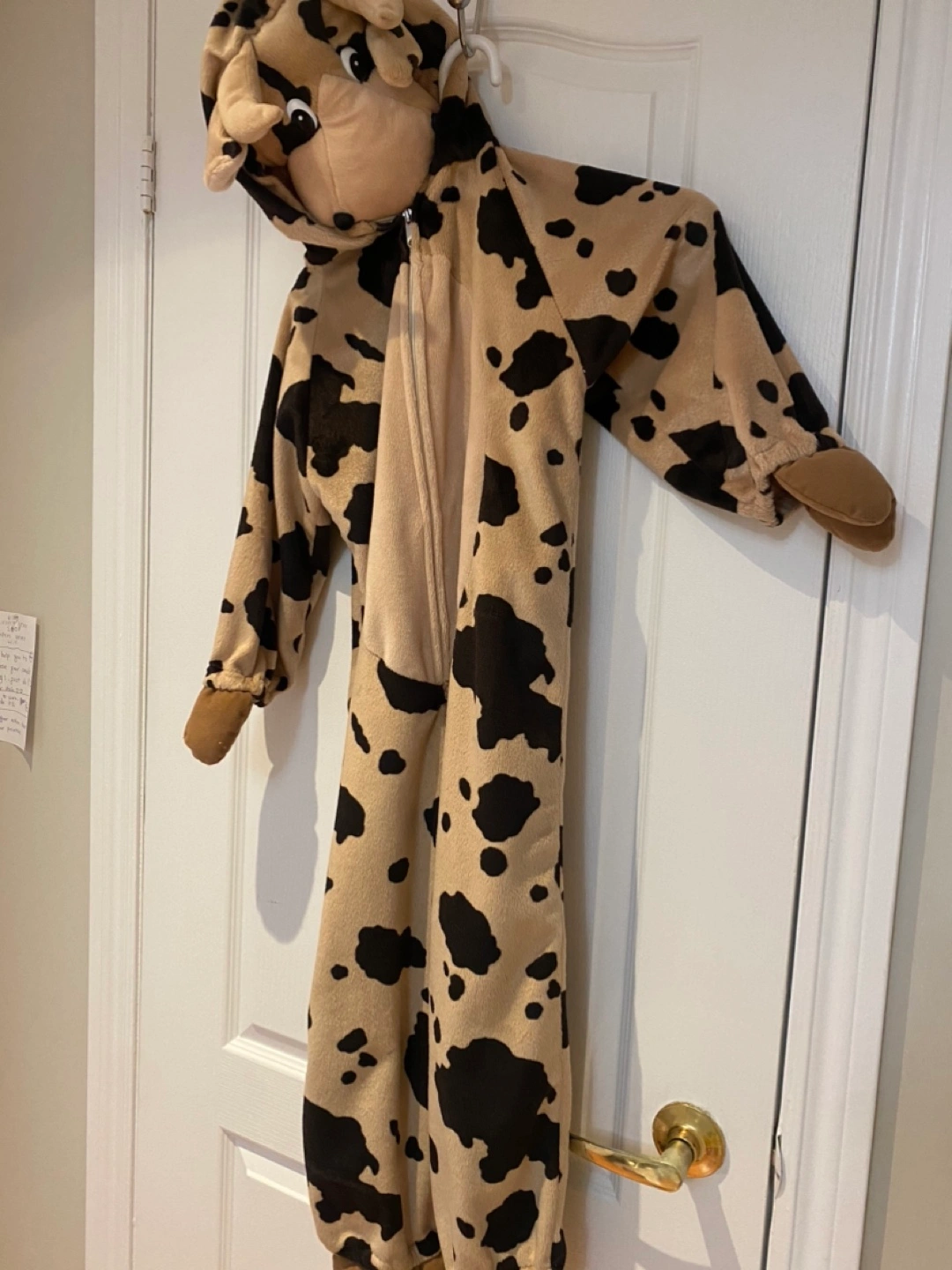 One piece cow costume. Featuring a hood with a cow face, complete with ears. It has a zipper. A great choice for snuggling up on a cool autumn day for Halloween! Great conditions, used once only Kids 7-9 can wear, both boys and girls