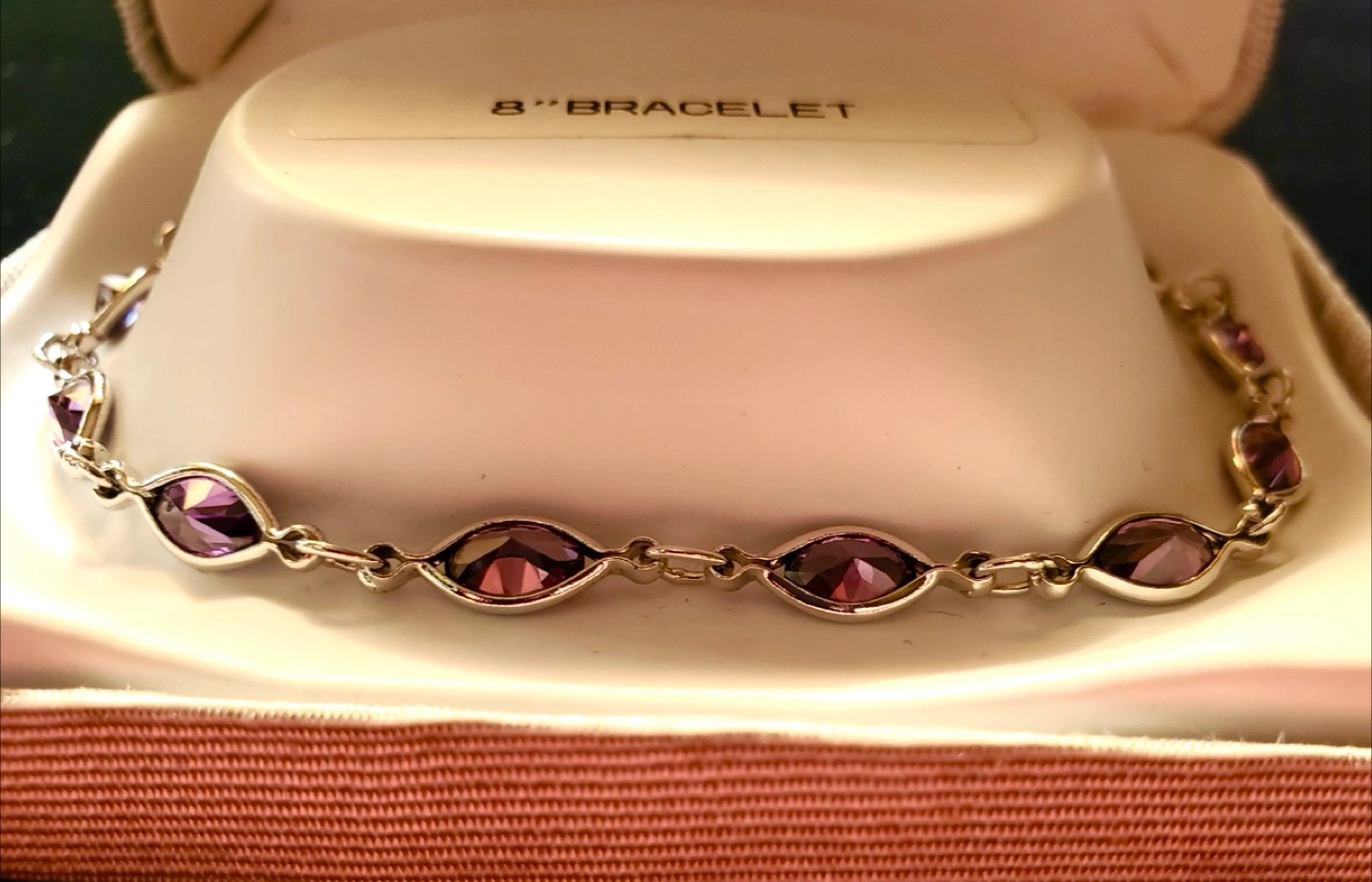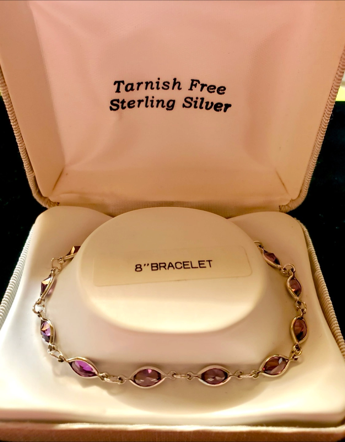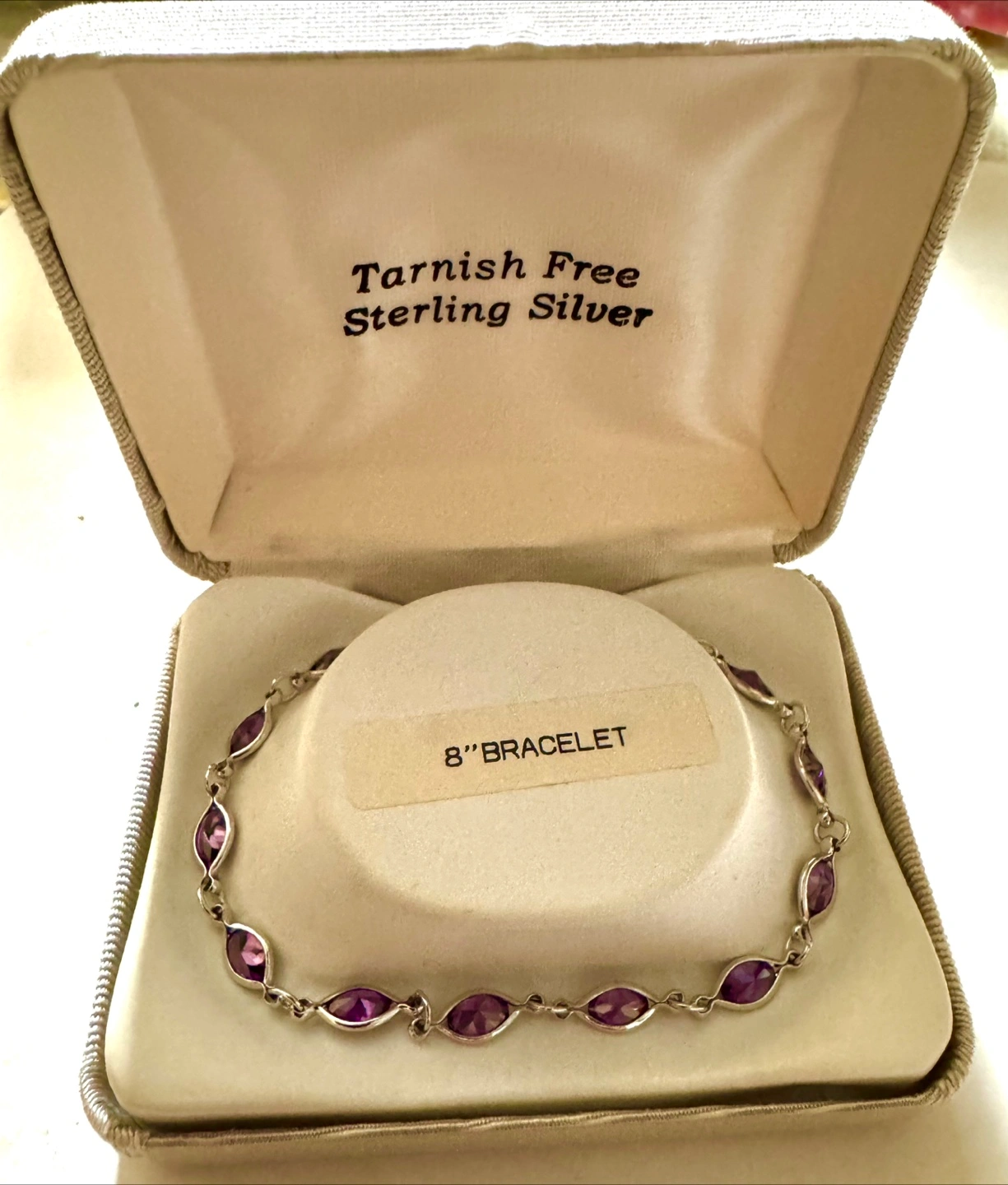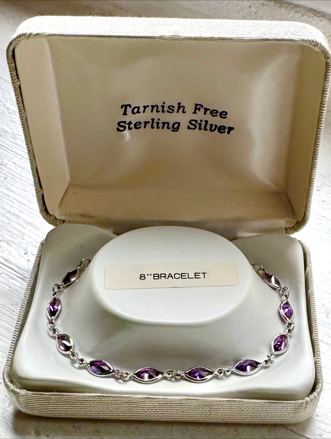 A beautiful sterling silver bracelet. The bracelet features real amethyst stones. Comes with its original box. Wearing this piece can certainly make you feel more relaxed.