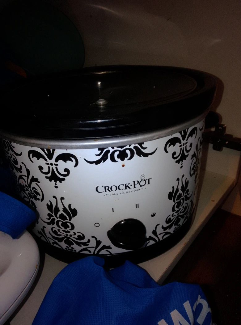 105Round slow cooker with a black and white design. Features a black lid and dial. Perfect for soups and stews, preparing a comforting meal.