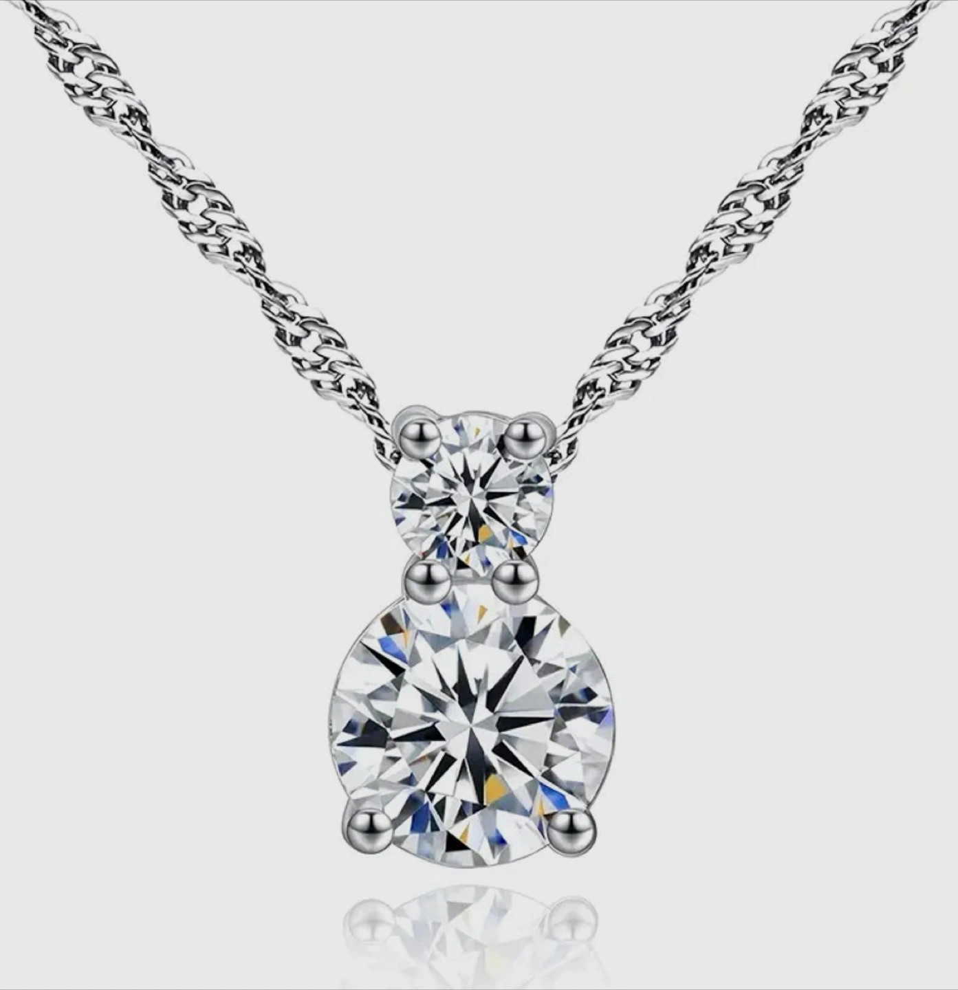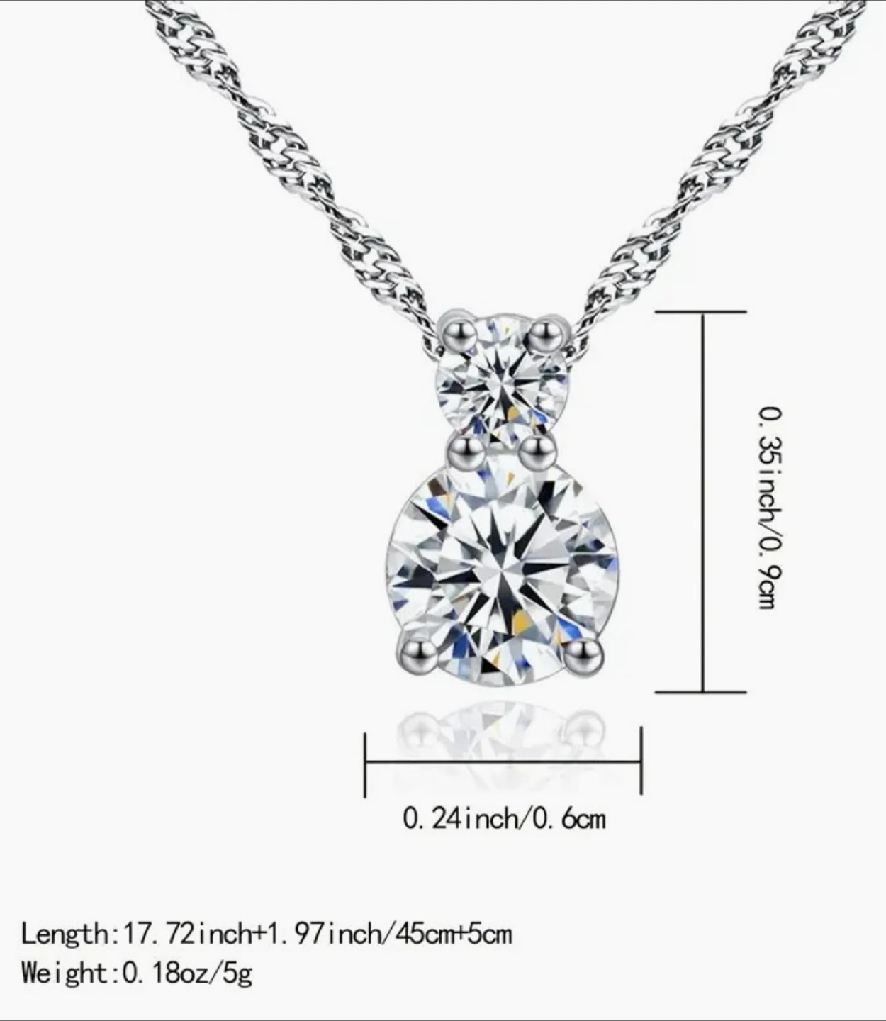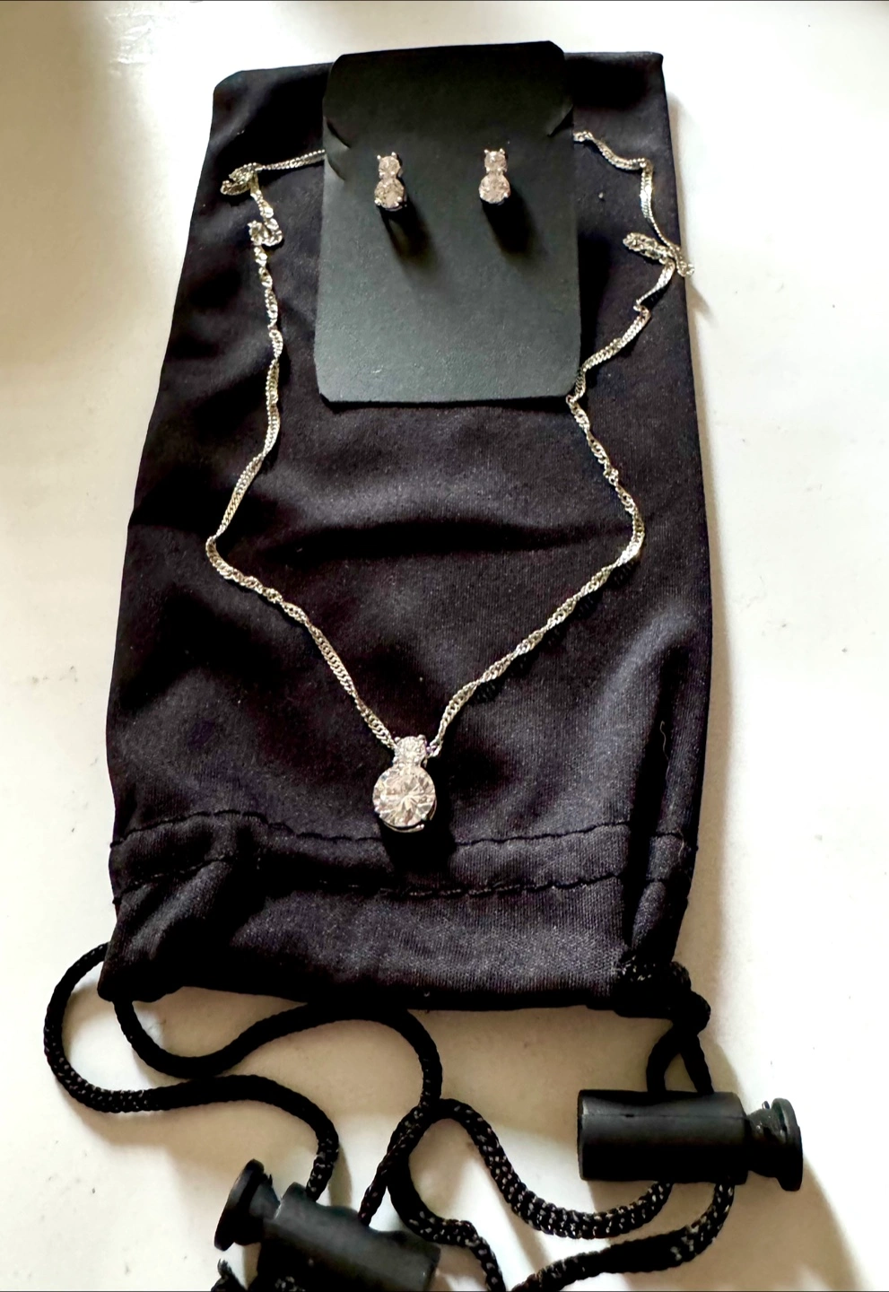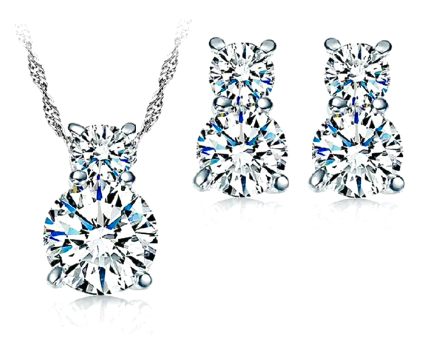 The necklace and earrings feature a 925 Sterling silver chain. The pendant has two round-cut stones. The earrings also feature two stones.