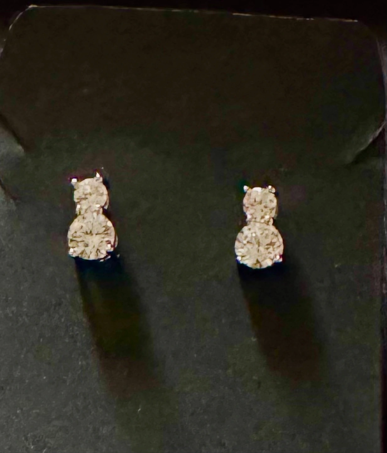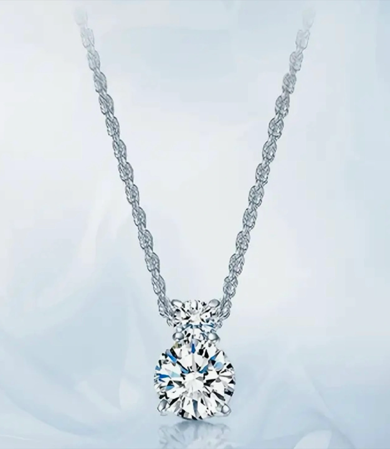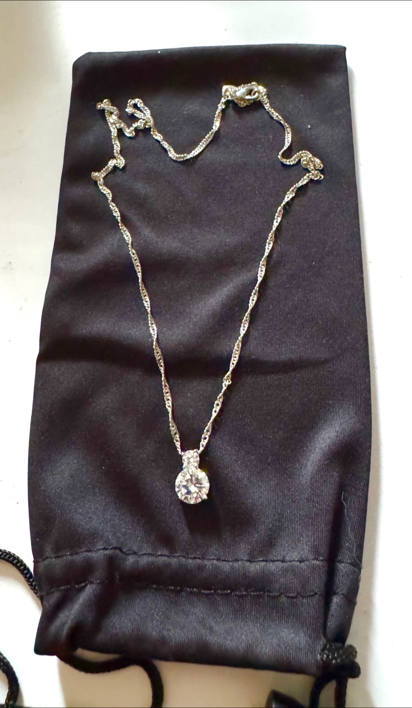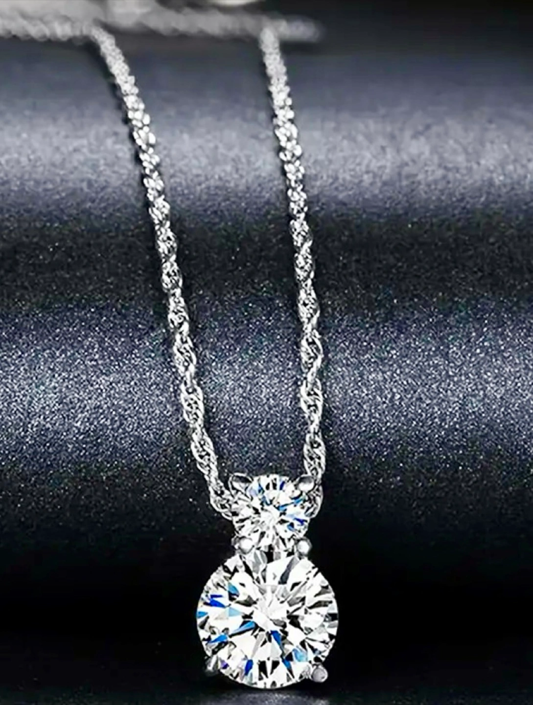 The necklace and earrings feature a 925 Sterling silver chain. The pendant has two round-cut stones. The earrings also feature two stones.