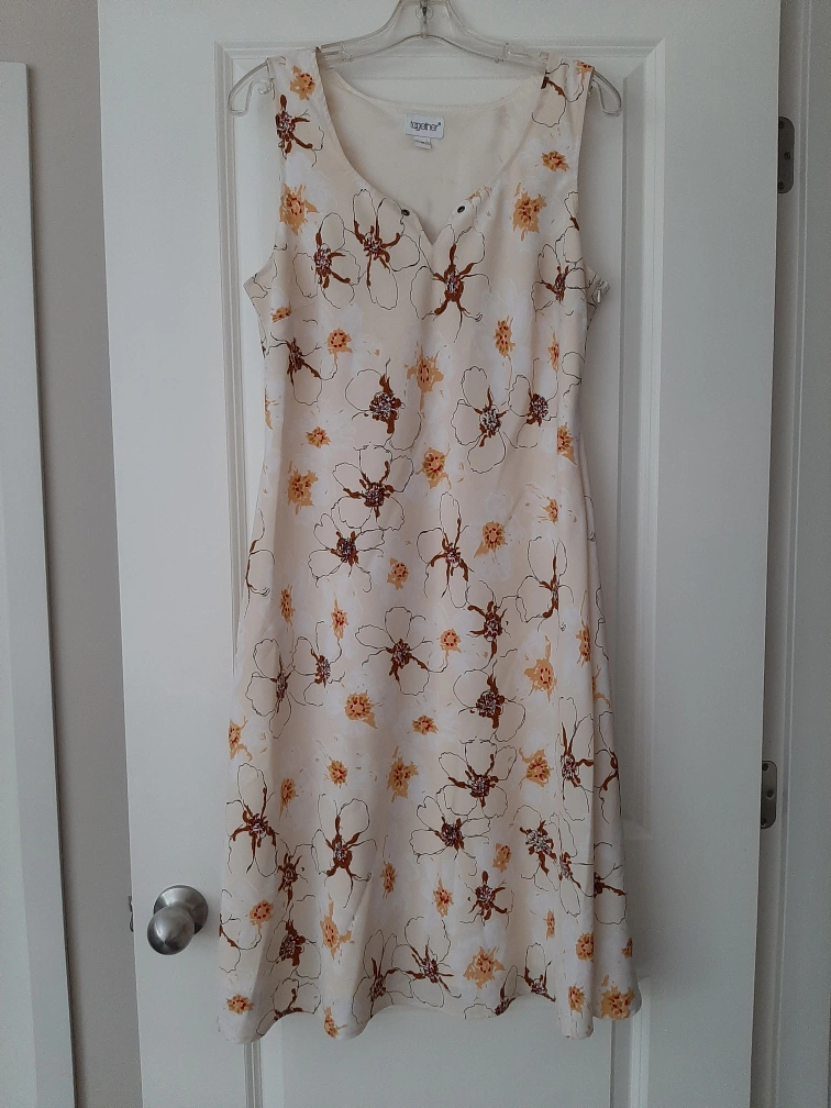A floral dress, sleeveless and mid-length. The dress features a scoop neckline, and three button details. A great choice for a relaxed, sunny day.