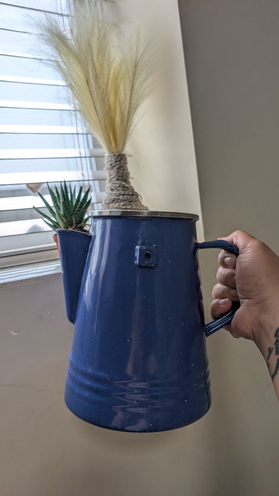 Blue enamelware coffee pot. Features a spout and a handle. The exterior is blue with white speckling. You can enjoy this gorgeous vintage piece and feel relaxed while you make your morning brew. π₯π₯