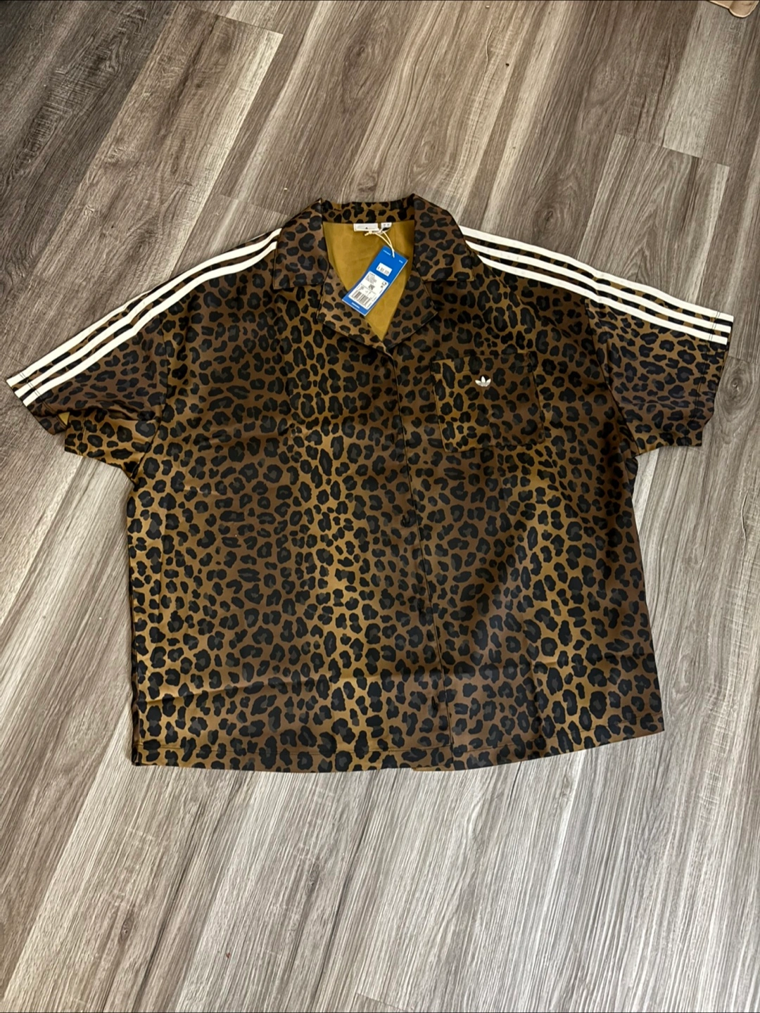 Leopard print shirt. Short sleeves with white stripes along the sleeves. Classic collared style. Wearing it is a nice way to relax after a long day.