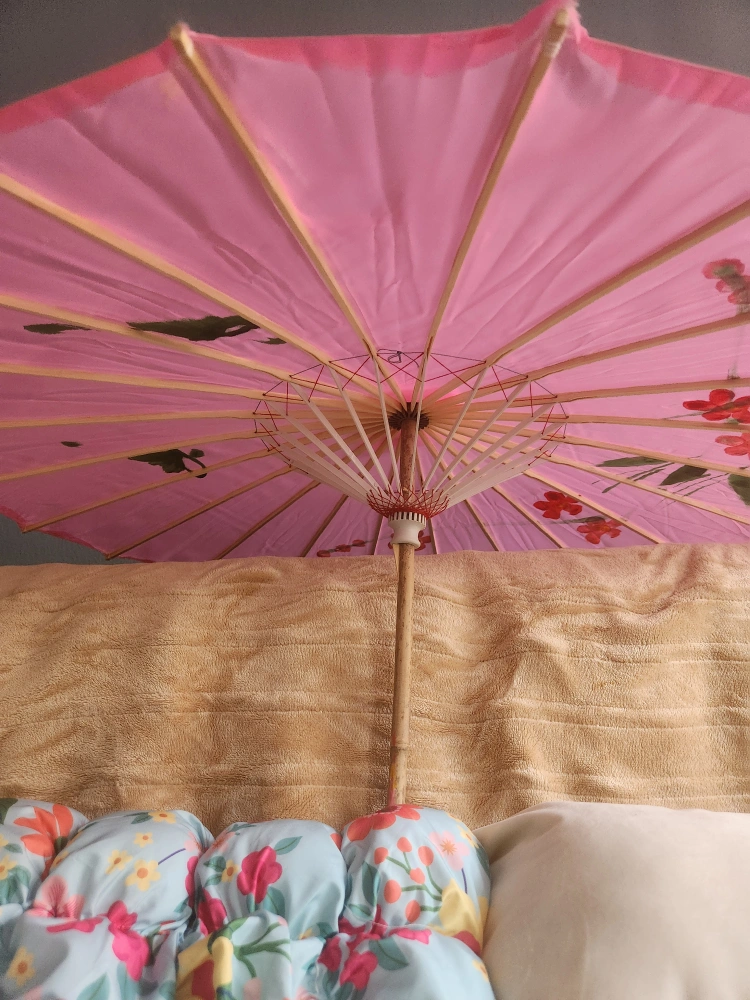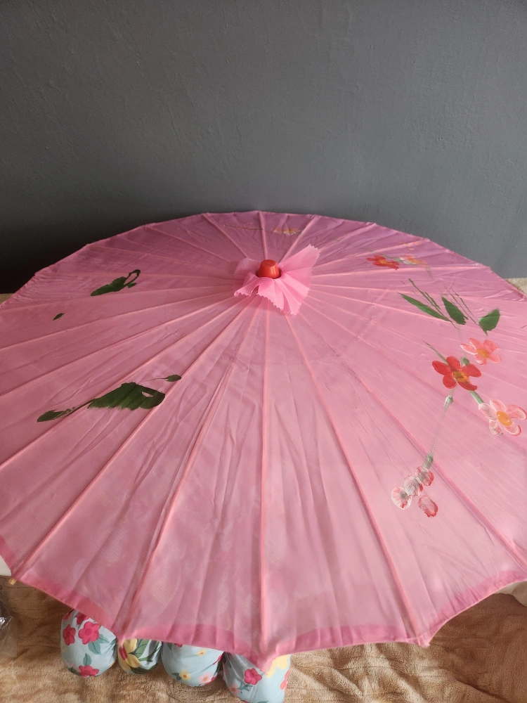I am selling this lovely pink parasol. Features floral patterns across the top. The parasol has a wooden handle. Imagine yourself using this beauty on a peaceful sunny day.